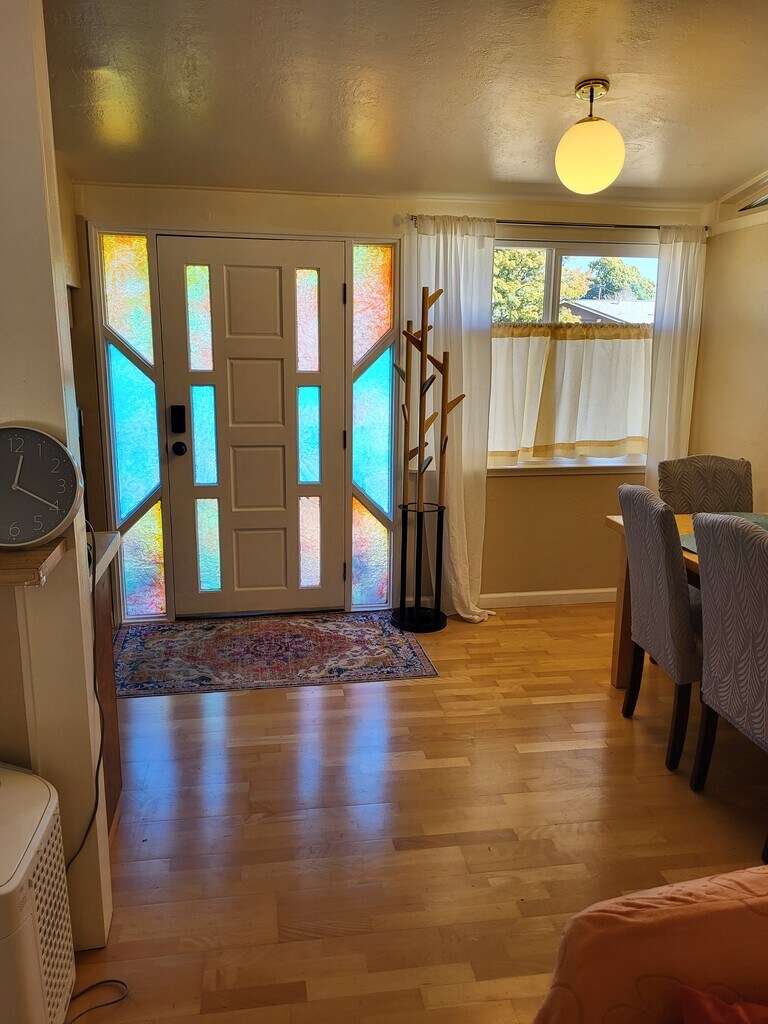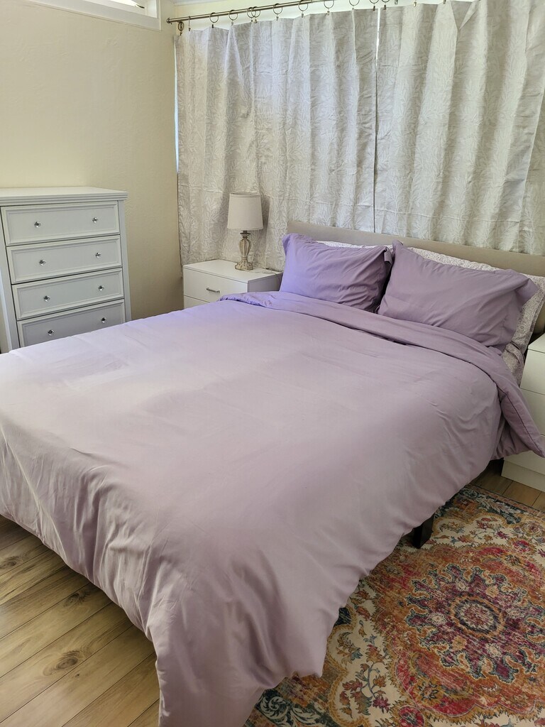 Feel at home and relax in this 2 bedroom 1 bath, which is in a safe and quiet area. The home is surrounded by lots of trees, vegetable gardens, fruit trees and flowers.The front door opens to a huge room, the dining table to your left and the kitchen to the right. Beyond the dining area is the living room with a smart TV, and a window AC that cools down this huge space. Behind the living room is a sitting area with a desk n chair. The kitchen has an electric stove with working oven, a huge double door fridge. Kitchen has all utensils, pots, spices, dishes, toaster oven, coffee maker, blender, juicer, Aqusana water filter. Down the passageway is the bathroom with towels, shampoo, conditioner, shower gel, blow dryer, walking tub, with showers. The jacuzzi upper jets do not work properly but the lower jets does work. The bedrooms have brand new queen beds with hybrid mattress, 2 dressers, desk, chair, fan. Other passage way leads to a closet and the master bedroom which is closed off. There are patios with tables n chairs outside, and also decks. The washer and dryer is in the garage area and is shared. Parking is on the right side of the driveway and lots of street parking. No pets are allowed. No smoking on the property. Quiet hours are 11pm to 7am. Minimum 1 month rental. Month to month or 6 months lease.