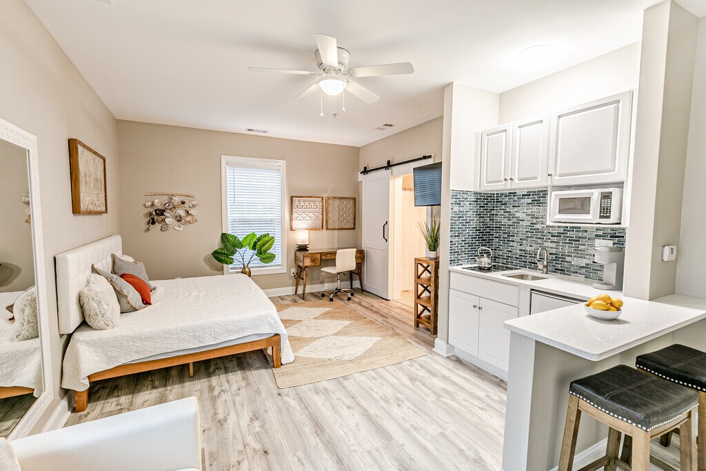 Ground floor Studios w/ Modern decor located at renowned World Tour Golf Resort. All inclusive rent. Short term. Utilties & Wifi included. The Grande Villas offer luxury, peace & quiet, only minutes from the Ocean. Located in the section known as Carolina Forest, this villa is a short stroll to the pool, fitness center & clubhouse with onsite bar/restaurant. Great for golfers, couples, travel nurses, solo adventurers, business travelers, and small families.