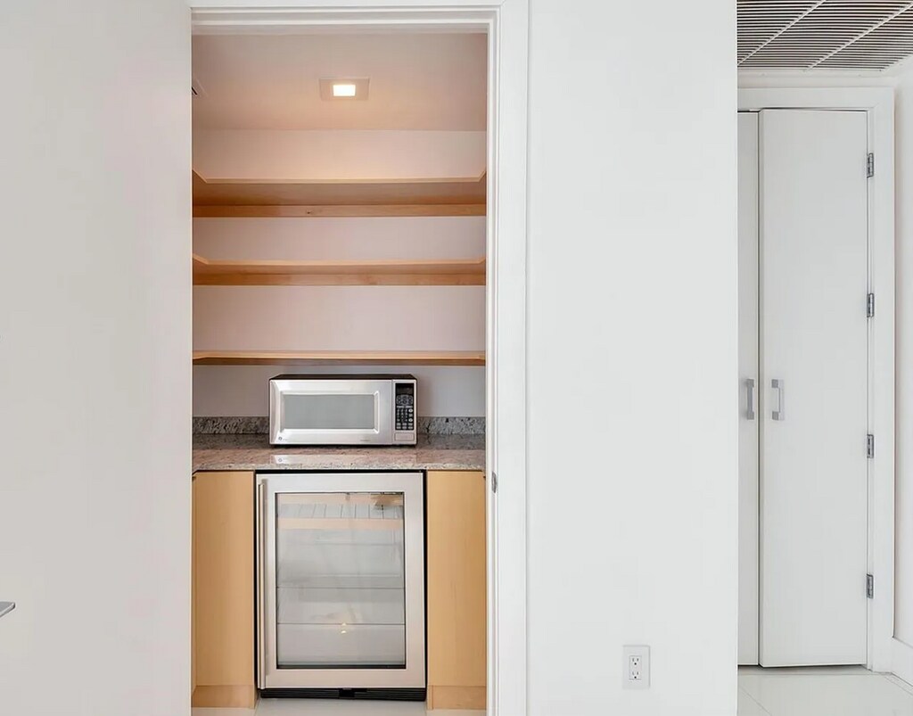 Fully renovated 2-bedroom, 2-bath high-floor, southwest-facing loft-style unit, ready for immediate move-in. This tastefully designed condo features white marble flooring throughout, high-end fixtures, and a kitchen island with a dining area, marble countertops, and premium appliances. The primary bedroom was relocated to optimize space, creating a spacious living/dining area and a den/TV room (second bedroom) with direct terrace access for added privacy and convenience. The unit includes a built-out bar/pantry with a wine beverage fridge, ample custom closets, and a full-size washer/dryer. Recent upgrades include a new AC and water heater. Comes with two valet parking spaces and a storage locker. Steps from Museum Park and Miami World Center, with easy access to public transportation and I-95.