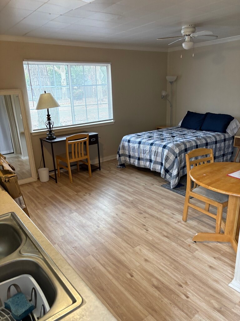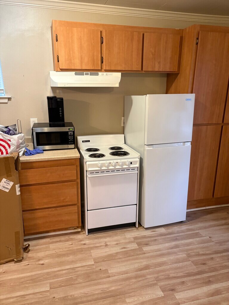 Charming and fully furnished studio with private bath, located just minutes from Bidwell Park, Sycamore Pool and downtown Chico. This cozy unit features a full kitchen equipped with everything you need, including a complete set of dishes, glassware, silverware, cookware and utensils for 4. Full size bed, dresser, table with chairs, full length mirror and cable ready tv. Enjoy your morning coffee or unwind in the evening on your private, fenced patio, with a washer and dryer conveniently located just off the patio. Ideal for a quiet, comfortable stay with the convenience of nearby recreation and downtown. Qualifications: Pass background checks; Minimum Credit Score of 760 with verifiable income of 2.5 times rent. Renters Insurance required. 1 year lease. $225 monthly fee for utilities (internet, water, gas, electricity, sewer and garbage)