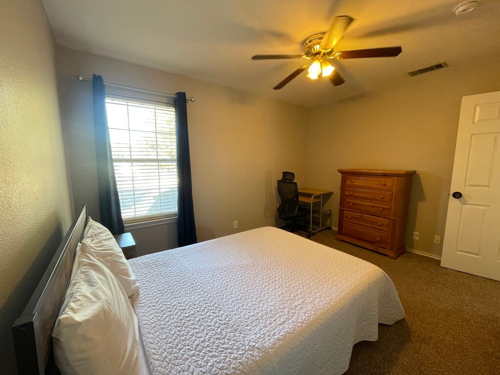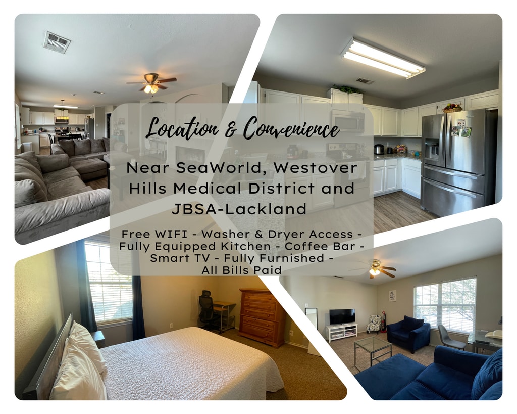 This comfortable private room offers the perfect blend of peace, space, and convenience. The room is large enough for a bed, desk, and storage without feeling crowded, making it ideal for anyone who needs a calm place to sleep and work. You’ll share a clean, well-maintained bathroom with one other adult who value cleanliness and privacy. The home itself is recently updated, quiet, and kept in great condition—perfect for decompressing after work. Shared spaces include a fully equipped kitchen, a cozy dining/living area, and in-home laundry, giving you everything you need for simple, convenient living. Fast Wi-Fi, central A/C, and a peaceful atmosphere make this a comfortable, low-stress option. Located in a safe neighborhood near SeaWorld, Lackland AFB, major employers, and shopping, it’s great for traveling nurses, military, and working pros who want a dependable, no-drama place to call home. Message to schedule a tour and secure your spot.