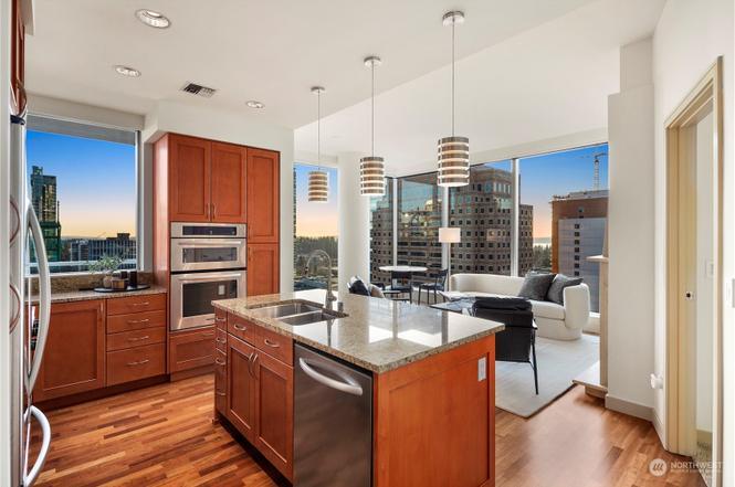 If you're looking for a luxury condo that eliminates sitting in traffic and is walking distance to Bellevue's wonderful restaurants, parks, and nightlife, Welcome home! This luxurious 16th floor condo features floor-to-ceiling windows, private balcony with sweeping city views. Southwest facing 2 bedroom, 2 bath corner unit in Washington Square Tower. It has brand new stainless steel appliances, in-unit laundry, automatic shades, and a fantastic balcony to enjoy your morning coffee. Freshly painted interior throughout, building amenities include a full-time concierge/night doorman, massage rooms, spa, secure storage unit, owners lounge with chef's kitchen, EV charging and resident fitness facility. Home comes with two assigned side by side parking spaces and one storage unit.