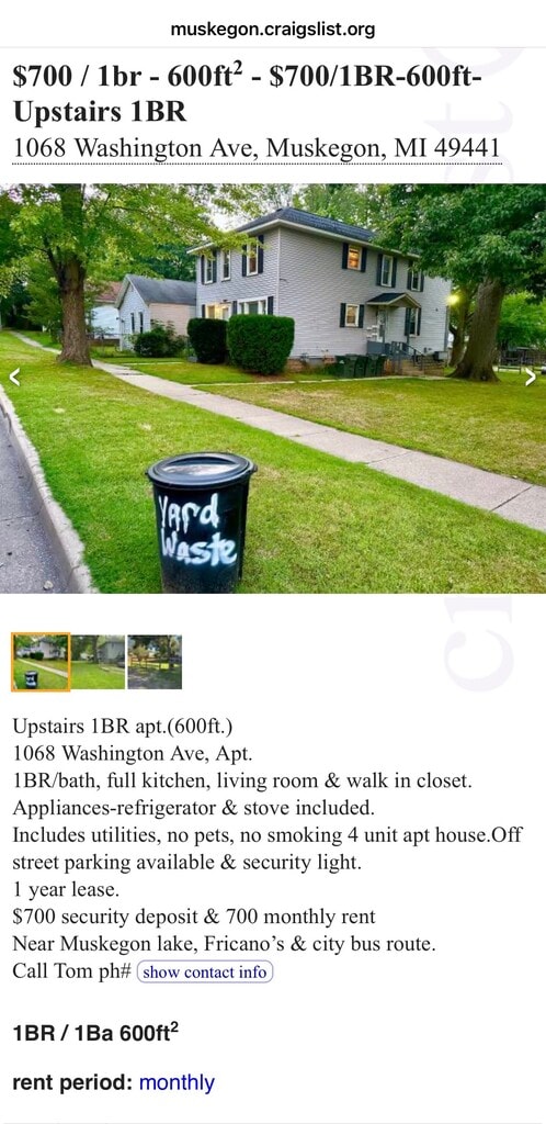 Upstairs 1 BR apt.(600ft) 1068 Washington Ave Apt 4. Available February 28th,2026 1bath, full kitchen, living room, & walk in closet. Appliances included- refrigerator & stove. Includes all utilities, no pets, no smoking. Off street parking available & security light. 1 year lease. $700 security deposit & $700 monthly rent Near Muskegon lake, Fricano’s & city bus route.