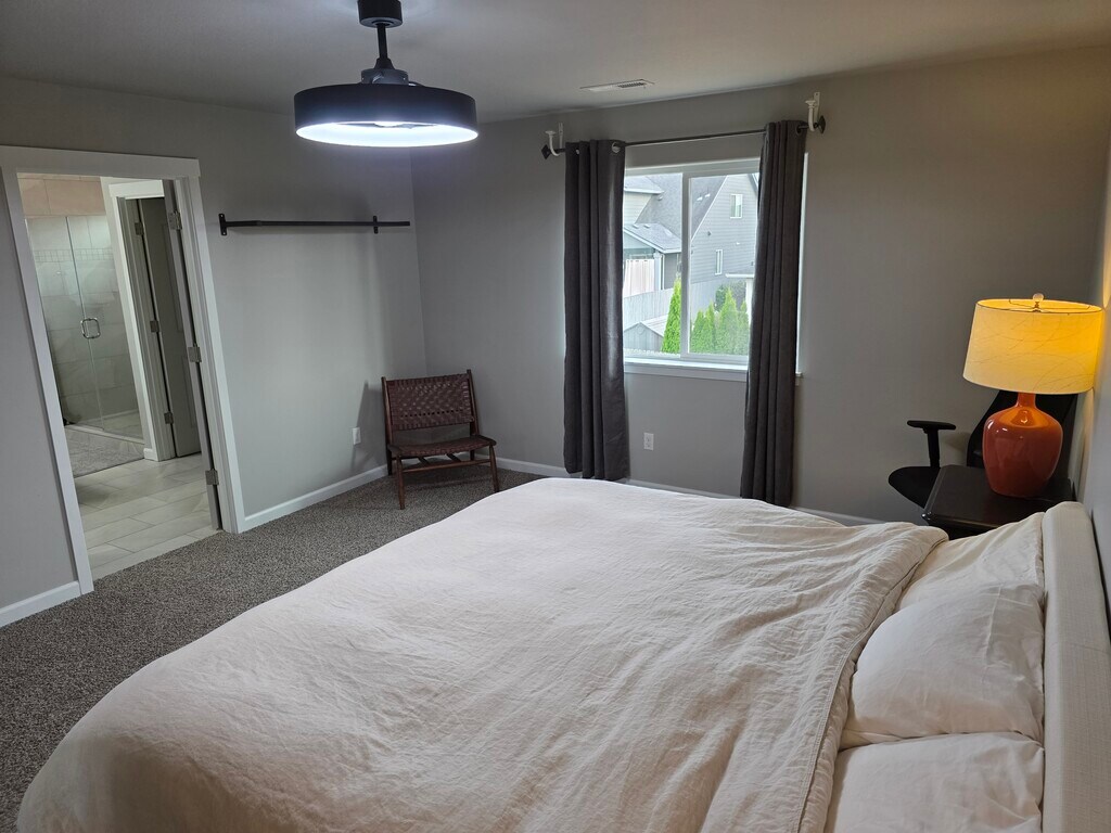 Furnished Room with Private Bath – $1,300 (Utilities + Wi-Fi Included) for month to month, $1250/month for a year lease. Available immediately. In a shared 6-bedroom, 3-bath home (2,589 sq ft total living area) near Vancouver Mall and I-205, about 15 minutes to Portland. --- Private Suite Bedroom: 15'7 × 10'5 (8' ceilings) Private Bathroom with bidet: 9'4 × 8'1 Walk-In Closet: 11'6 × 6'11 Private Toilet Room (en suite): 6' × 4'1 Approximate Total Suite Area: ~391 sq ft Furnished with a king-size Thuma bed, bedding, a foldable desk with computer chair + lamp, one floating shelf, a pair of nightstands with lamps, and full-length mirror in the closet. You may also use the other shared bathrooms when convenient. --- Home & Amenities Central air conditioning and heating for year-round comfort Shared, fully stocked kitchen with plenty of cabinet space, plus laundry and common areas Parking: first come, first serve two-car driveway, plus one car space on the sidewalk in front of the home. Plenty of additional street parking available around the house. Light household chores are rotated fairly among housemates to maintain clean shared spaces --- Current Household The home is quiet, respectful, and smoke-free. Everyone values a clean, calm living environment with clear communication and consideration for others. We currently have 5 male tenants, 1 female tenant. --- Terms $1,300 per month, including all utilities and Wi-Fi No pets, smoking, or drugs Proof of income required