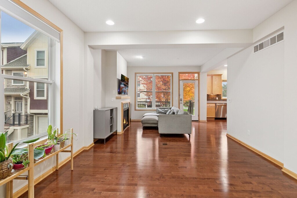 Upscale end unit in beautiful Dancing Waters. Spacious main level floor plan features kitchen with SS appliances and quartz island and countertop, gas fireplace, large master suite, and deck overlooking green space. Extra large upper level loft space and additional square feet provided by the finished lower level. New coat of paint completed for the entire interior of the townhouse. Premium neighborhood amenities are steps away that include a pool, park, and trails. Exterior maintenance free living with snow removal and lawn care responsibility of Association. Under 833 school district which is one of the best school districts in the area.