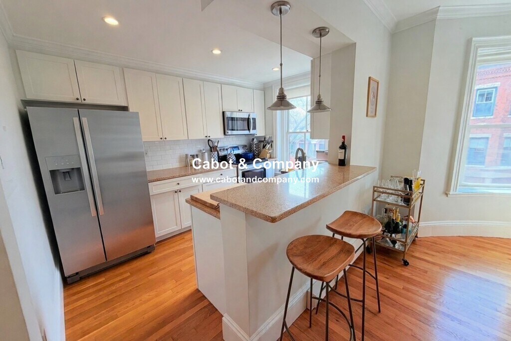 Wes Byrne | CABOT AND COMPANY | No Fee Newly renovated, generously proportioned unit on upper floor with exceptional light. Sun-filled kitchen with white wood shaker cabinetry, silestone countertops and breakfast bar. Bathroom with honed marble basket weave floor, metro tile surround, pedestal sink, bead board wainscoting and laundry/linen closet. Large master bedroom, good size second bedroom, and private deck. Crown molding, recessed lighting and oil rubbed bronze oval knobs.