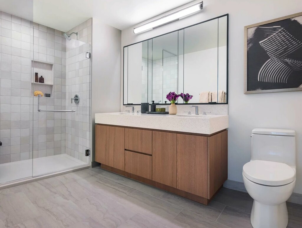 This spacious 3BR 2BATH residence features beautiful eastern views. A large wrap around kitchen that is perfect for entertaining is complete with back-painted glass upper cabinetry, Bosch and Fisher Paykel integrated appliances, three centimeter quartz countertops with full height backsplash, and a pantry. This home features 9'6" ceilings, roller shades, wide plank flooring throughout, and spacious customized closets. Enjoy an impressive walk-in closet in the primary bedroom and dual sinks in the ensuite bathroom.