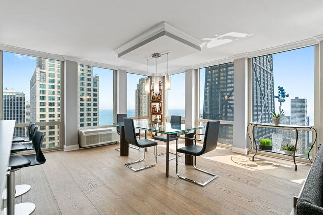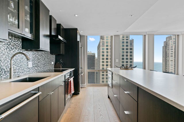 THIS 2BD/2BA 1600 SQ FT CORNER UNIT HAS IT ALL! Completely gutted and rehabbed in 2019, this remarkable unit offers floor to ceiling windows with spectacular views of the lake, Navy Pier, Oak St beach and Michigan Ave. Walk to all the best restaurants and shops that Chicago has to offer! Beautiful wide plank bamboo flooring throughout gives the home a sophisticated and modern touch. The gorgeous kitchen with a massive 10' island has quartz countertops and features a GE wine fridge, Kitchenaid stove and refrigerator and Sharp Microwave. The primary bedroom has custom closets and an en suite bathroom with a double vanity and waterfall rain shower. Hunter Douglas remote controlled blinds throughout the entire home. Second bedroom features a queen sized bed. Den features custom closets for even more storage. W/D in unit! Full amenity building includes 24 hour door staff, outdoor pool and sun deck, work out room, grill deck, large party room and dry cleaner. Don't miss out on this incredible offer!! listing courtesy of: RE/MAX PREMIER NB Elite