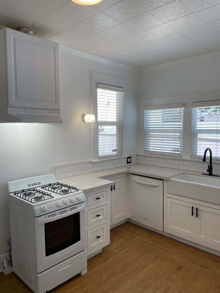 Look no further than this charming 3 bedroom, 2 bathroom (2 bed/1 bath in front + 1 bed/1 bath in back), house in Gardena. This home offers a large living area with plenty of natural light, updated bathrooms, a separate laundry area and an amazing in-law suite! Upon entering, a french door will lead you into the first bedroom that contains a spacious armoire, ceiling fan/light and a large window allowing for great natural light. The spacious living and dining areas contain recessed/dimmable lighting along with a ceiling fan. The second cozy bedroom has a large walk-in closet and just outside is a hallway with plenty of storage space in the cabinets. The remodeled bathroom features sleek black tile floors and large marble tiles make up the shower along with black fixtures throughout. Walk into the spacious and open kitchen to granite countertops, appliances and plenty of cupboard space. Go through the backdoor where you will find a separate laundry room in which another door will lead you outside and access to the in-law suite. The suite features a kitchenette with a small fridge, microwave, and a stainless steel sink with a garbage disposal. The remodeled bathroom features a shower with white subway tiles and a vanity. Step into the partially furnished bedroom with high ceilings, a ceiling fan, 50-inch smart TV, a full size bed with frame, coffee table, side chair, and a large closet. This home is centrally located, near 91 and 110 freeways for easy access to neighboring cities! Amenities included: dishwasher, updated bathroom, washer dryer, and in-law suite. Utilities NOT included. Date Available: ASAP. $3,550/month rent. $3,550 security deposit required.