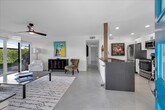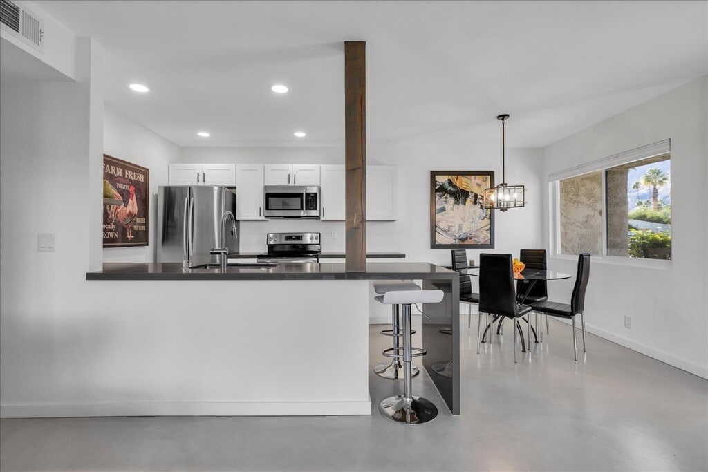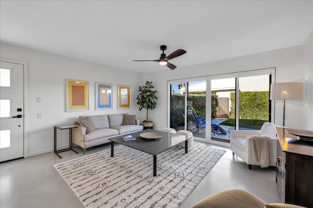 Welcome to Ramona Villas, a gated community designed by renowned architect Richard Harrison. This remodeled, single-level, 2 Bed, 2 Bath end unit is situated with only one shared wall, no neighbors above or below, and no steps. The light-filled interior features skylights, New concrete flooring, New dual-pane windows and sliders, an open-concept living area, and upgraded kitchen and baths. The spacious primary suite includes two closets, a remodeled ensuite bath, and direct patio access. A second bedroom is located across from the hall bath. Full-size stacked washer and dryer included. The private north and west facing Private backyard offers two covered patios, a lawn area, mountain views, and the option to fence with HOA approval. A front lawn enhances the single-family-home feel. Ideally located across from the clubhouse, saltwater pool and spa, fitness room, and sauna, and just steps to EV charging stations and tennis court. The end-space covered carport includes built-in storage cabinets plus an additional exterior storage closet. The low HOA rear-yard maintenance.This secure gated community is just minutes from downtown Palm Springs dining, shopping, and entertainment.