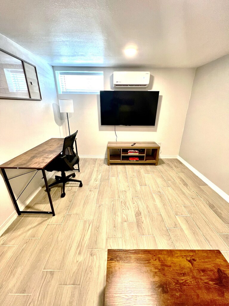 Experience compact luxury in our remodeled tiny home. This 1-bed, 1-bath space maximizes comfort with a plush queen bed for two. Relax in the living area, furnished with a cozy sofa and TV. Whip up meals in a sleek kitchen, complete with a peninsula and essential appliances. For remote work, there's an adjustable robotic desk paired with an ergonomic chair. Merging function and style, this home defines modern, efficient living. Dive into a unique blend of coziness and innovation!