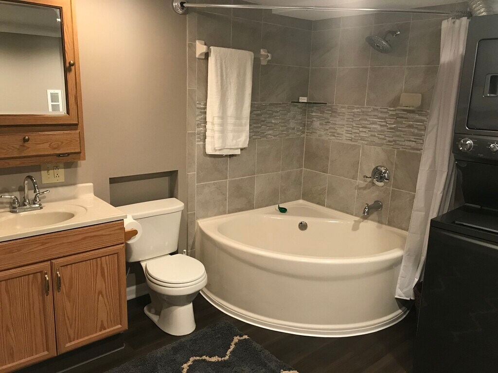 furnished apartment with 1 BR, Kitchen and large Living room, luxury bathroom with roman tub & Shower,, all new flooring, drywall, paint, washer dryer, refrigerator, stainless steel, absolutely gorgeous!! Fully furnished, all utilities and paid for additional $225. per month, includes TV, Internet, GAS ELECTRIC, WATER, SEWER, GARBAGE ETC... Cozy warm and all new! FREE LAUNDRY!! Includes King bed, LARGE flat screen TV, corner roman tub and shower, 3 recliners, and all plates, dishes pots and pans. You pay nothing more, all is paid, fast internet, TV, heat, AC, etc... Great neighborhood, near I-280 for easy access to all of Quad City area!! no pets, No smoking Owner is licensed Broker