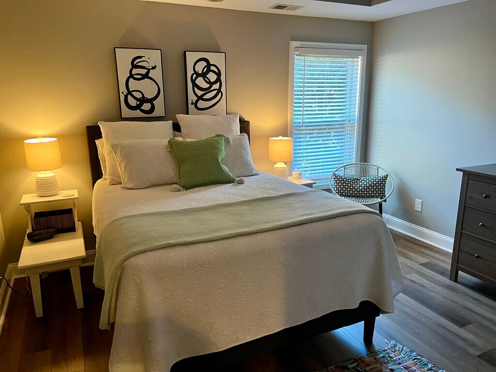 Modern luxury, fully furnished apartment in upscale Kennesaw/West Cobb area. Great for corporate business or short-term rentals! Fully equipped entire floor apartment conveniently located near restaurants, hiking trails, and local points of interest. The property includes access to a large scenic back yard with patio/swing, and walking trail access. Amenities: Large family room with internet TV and electric fireplace. One bedroom with queen bed, one bath with walk-in shower, full kitchen, washer/dryer. Quiet, safe neighborhood. Private entrance with parking access. All utilities included. No pets, smoking, or loud music.