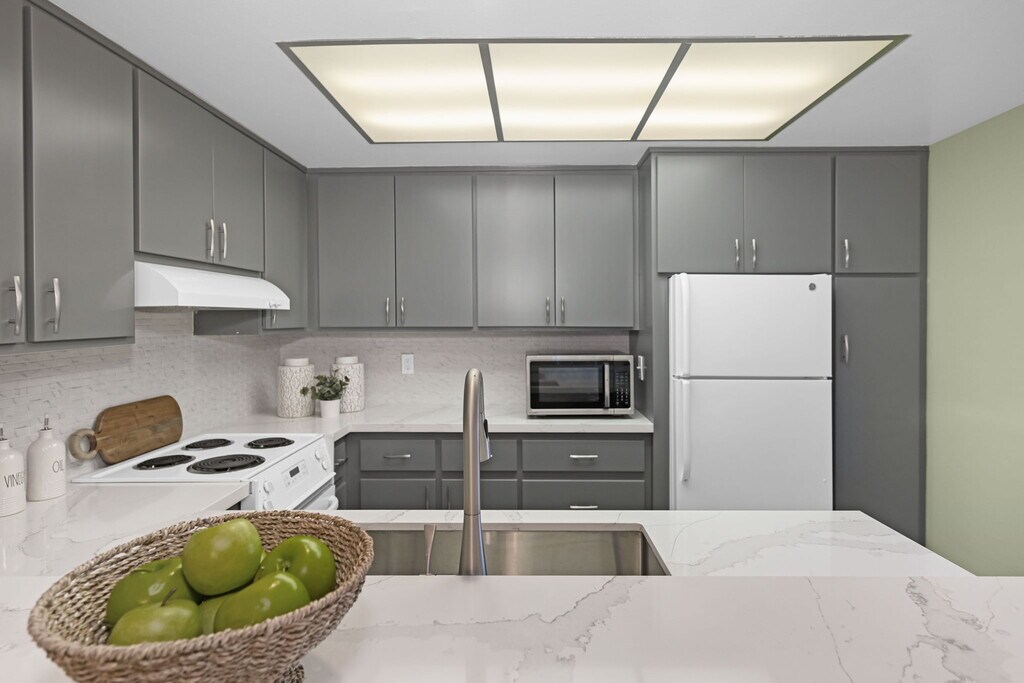 Are you looking for a Level-In unit which includes an entrance with no stairs? Do you need easy access from the carport to your home? Welcome to this beautifully updated, end-unit nestled in a peaceful location in the heart of Rossmoor. Enjoy the best of indoor-outdoor living with two private patios—one bathed in sunshine, perfect for gardening, and the other shaded for relaxing afternoons. Make your way inside to a tastefully renovated Carmel Floorplan interior featuring a brand-new kitchen with quartz countertops, marble backsplash, and wonderful cabinetry with under-cabinet lighting. The kitchen and entryway are finished with stylish ceramic tile, while new luxury vinyl plank flooring flows throughout the rest of the home. Crown molding and updated lighting add a refined touch. The bathroom has also been thoughtfully remodeled and includes an in-unit washer and dryer for added convenience. Freshly painted and move-in ready, this home offers easy level entry through the sliding door just beyond the guest parking and the carport. There’s also a charming rear pathway accessible from the back patio. Additional highlights include extra storage, a serene setting, and lots of Rossmoor amenities; pool, library, movie theatre, pickleball and more!