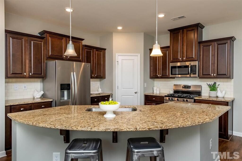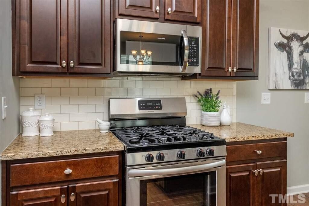 Centrally located, end unit townhome ready for you! Close to RTP. Only a few years old and impeccably maintained. Gorgeous hardwood floors on main floor with wide open living area. Great covered porch with a view onto a wooded buffer. Huge eat-in island with granite counters, tile backsplash, stainless steel appliances, walk-in pantry, gas range, and tons of cabinet space. Luxurious primary suite with huge walk-in closet, large tile shower with bench and double vanity. Spacious secondary bedrooms and laundry room.