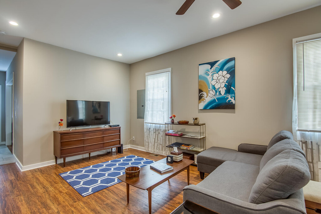Furnished 2BR/2BA Home in East Nashville – Fenced Yard, Pet Friendly, 2 Patios Fully renovated and fully furnished, this private 2-bedroom, 2-bathroom home in Historic Cleveland Park offers a spacious and well-equipped living space just three miles from Downtown Nashville. With an open floor plan and high ceilings, this 1,400 sq. ft. home provides a comfortable and functional layout. The home comes fully furnished, including a King and Queen bed, two twin-size convertible sofas, a TV, internet, kitchen supplies, linens, and a mix of vintage and modern furnishings. The kitchen includes stainless steel appliances, ample cabinet space, and newer laminate flooring. The living areas also have newer laminate flooring, while the bedrooms are carpeted. A fenced-in yard makes this home pet friendly, and the front and back patios provide private outdoor space. Additional features include off-street parking, a full laundry room with a washer and dryer, and extra storage space. Located on a quiet, tree-lined street with views of the Nashville skyline, this home is within walking distance of shops, schools, and public transportation. Rent: $2,450/month Size: 1,400 sq. ft. Lease Term: Minimum six months Pets: Allowed with fenced yard Flooring: Newer laminate in kitchen and living areas, carpet in bedrooms Parking: Off-street parking included Contact for more details or to schedule a tour.