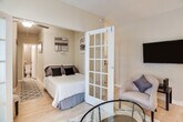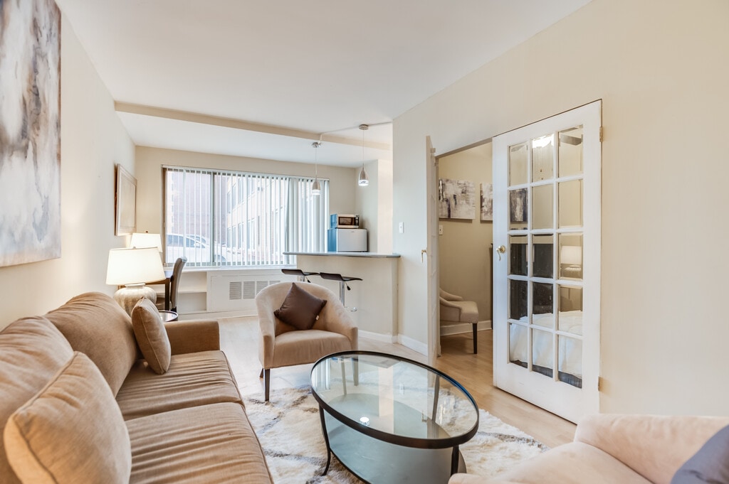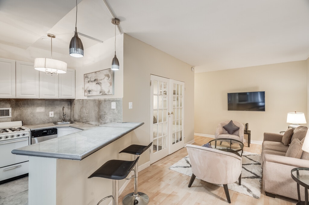 This stunning jr. 1 bedroom has been extensively renovated and upgraded. It has an open kitchen with a bar, beautiful countertops, and stainless steel appliances which include a dishwasher. The bathroom walls are all tiled. It has beautiful artwork. It is fully furnished and equipped, including all kitchenware, a coffee maker, a toaster, a microwave, a TV, an iron,and ironing board, and a vacuum cleaner. It has a full size bed. All utilities are included, including internet. You can just bring your suitcase. River Place is wonderful complex with many amenities including an extra-large, resort-style pool, spa, a state of the art fitness center, sauna, steam room, convenience market, hair salon, and a dry cleaner. It consists of 4 buildings. Each building has a concierge. The complex is gated and very secure, located in an upscale neighborhood. The location is fantastic: a block and half from the Rosslyn Metro. It is near the Iwo Jima Monument, walking distance over the Key Bridge into Georgetown, near the jogging and biking trails along the Potomac River, near DC, and near many restaurants, drugstores, and markets. It Is part of booming, exciting Rosslyn, gateway to DC. You can learn more about River Place by going its website You’ll love my place because of its location, its convenience, and its charm. My place is good for couples, solo adventurers, and business travelers.