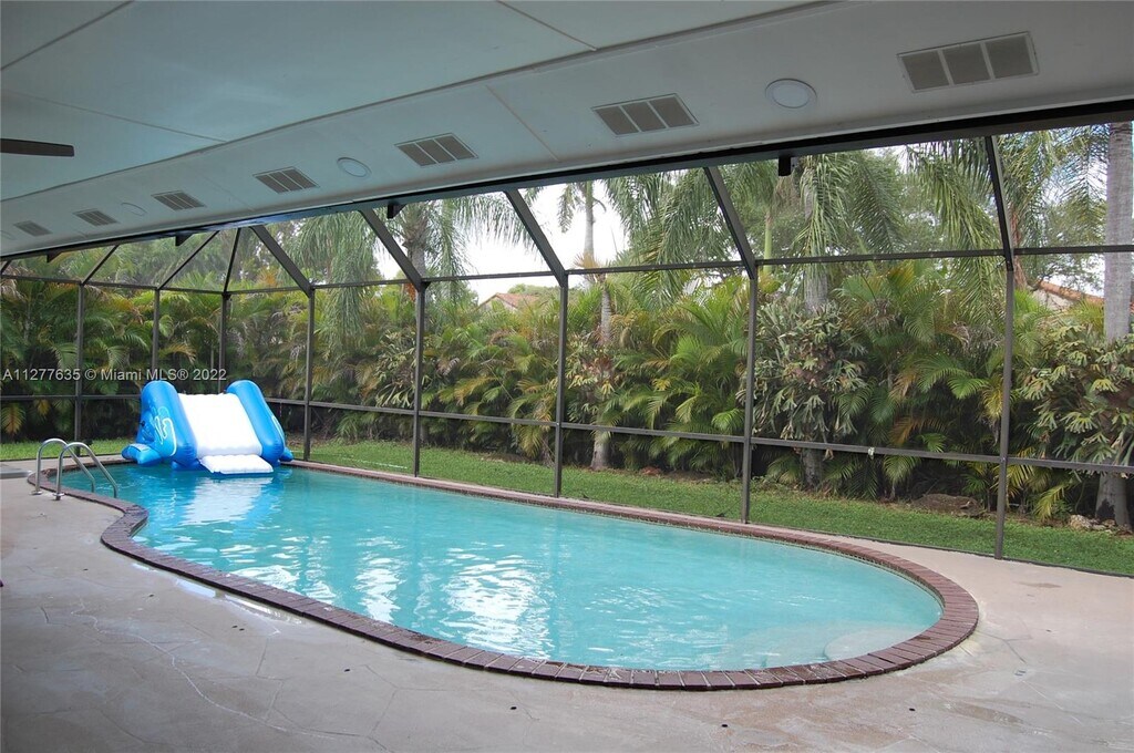 legantly updated and beautifully maintained single-family pool home situated on a quiet cul-de-sac in the sought-after Lindgren West subdivision near The Crossings. This home offers 2,494 adjusted SF and 2,860 total SF of living space. The primary bedroom features a pool view, walk-in closet, and en-suite bathroom, while two additional bedrooms and a shared bathroom are conveniently located on one side of the home. A guest bedroom/office with a nearby hallway bathroom is privately situated on the opposite side. The expansive kitchen boasts wood cabinetry, granite countertops, and stainless steel appliances, seamlessly connecting to the family room. Bathrooms are meticulously updated with top-quality finishes. Additional highlights include high ceilings, 24x24 ceramic porcelain floors, recessed LED lighting, a skylight, ceiling fans, a modern HVAC system, and a Nest thermostat. Open living spaces are bathed in natural light, with stunning pool views from the living areas and kitchen. The property is fully fenced and surrounded by lush tropical palms, with soffit lighting adding a warm glow to the exterior. Conveniently located near shopping and dining options, this home perfectly combines comfort, style, and practicality.