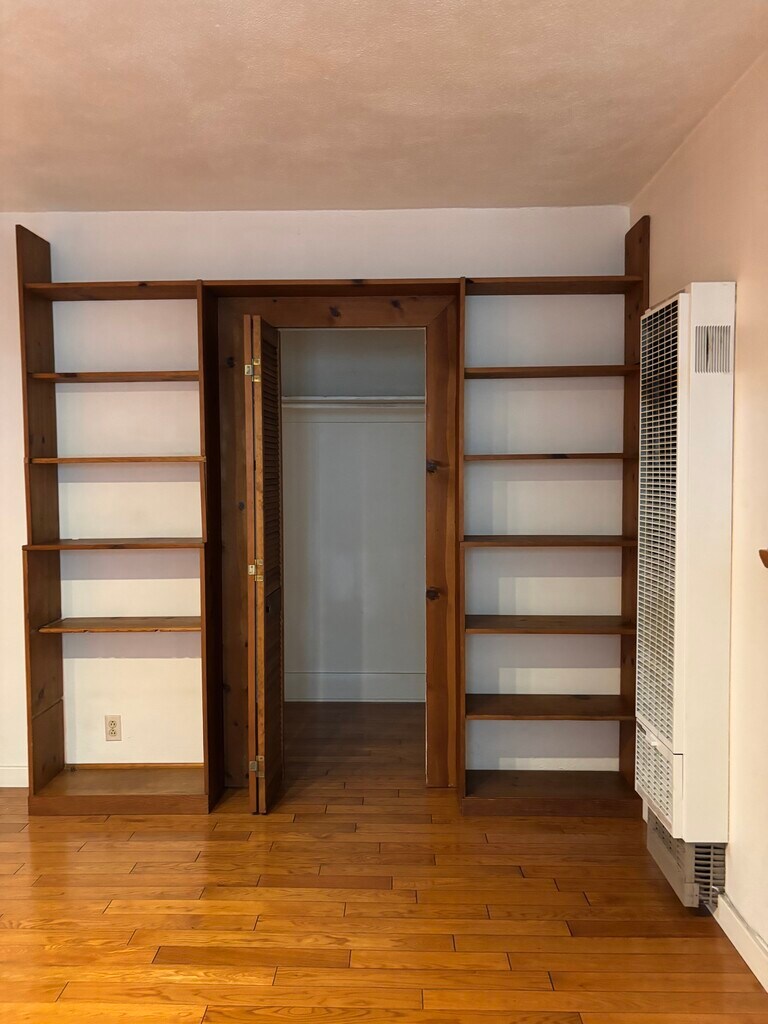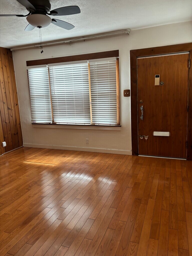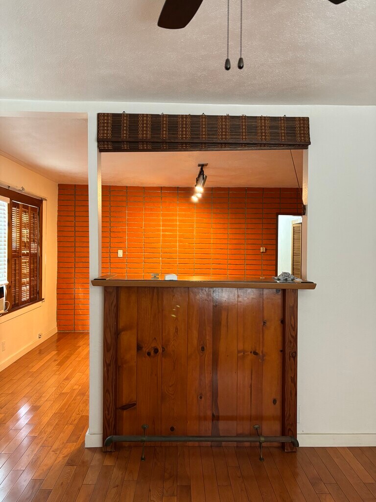 One bedroom, 1 bathroom duplex at 1127 S Rimpau Blvd., offers 990 sq. ft. of living space. The living room has ample room for relaxation and features cable readiness and ceiling fan. The dining room has built-in bookcases, accent wall, and a built-in bar. Both rooms have window blinds and shutters. The kitchen is equipped with a refrigerator and stove offering washer/dryer hook-up. The bedroom is spacious with large closet, storage space, and built-in desk. The bathroom includes a tub/shower combination and is equipped with necessary handrails. Additional amenities include A/C, heating, a security system, and Wi-Fi access. Large hallway closet and linen closet for additional storage. The exterior of the property is well-maintained, providing a welcoming atmosphere.