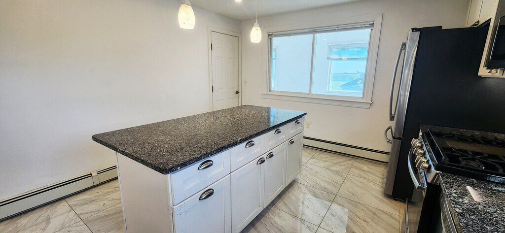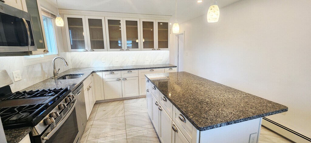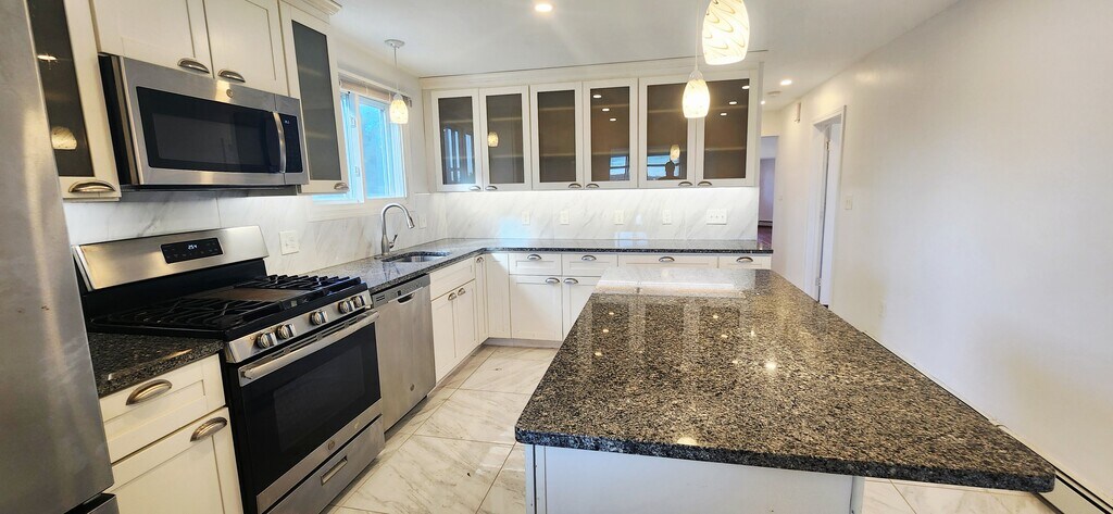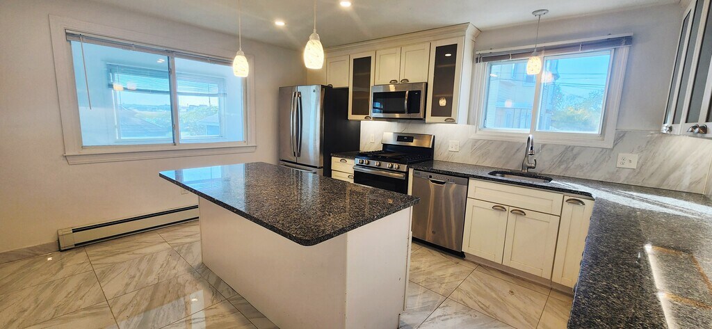 Available now for rent! Renovated apartment with 1 off-street parking near Wood Island T station in East Boston. This first floor, spacious 1300+ sqft, 3 bed 1 bath apartment features a huge chef's eat-in kitchen with tiled floors, granite counters and island, dishwasher, stainless steel appliances, plenty of cabinet space and windows overlooking the Boston Harbor. Other features include hardwood floors, tiled bathroom with stand-up shower, one large bedroom, one medium bedroom and one slightly smaller third bedroom, separate living room, shared coin op laundry in basement, 1 off-street parking space included, shared large backyard with gazebo and fenced yard with views of the airport and Boston skyline. Location is a very quiet and secluded, residential area of the neighborhood that is walking distance to the Blue Line (Wood Island T) with direct access to downtown Boston. Enjoy plenty of green space and walking paths with close proximity to Constitution Beach.