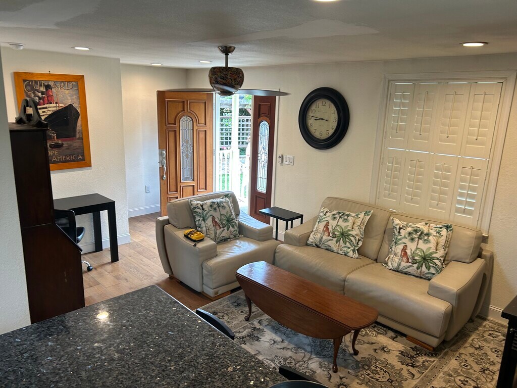 One bedroom garden cottage, private setting with private deck, furnished gas, cooktop microwave gas and electric PG&E included six months water garbage included off street parking