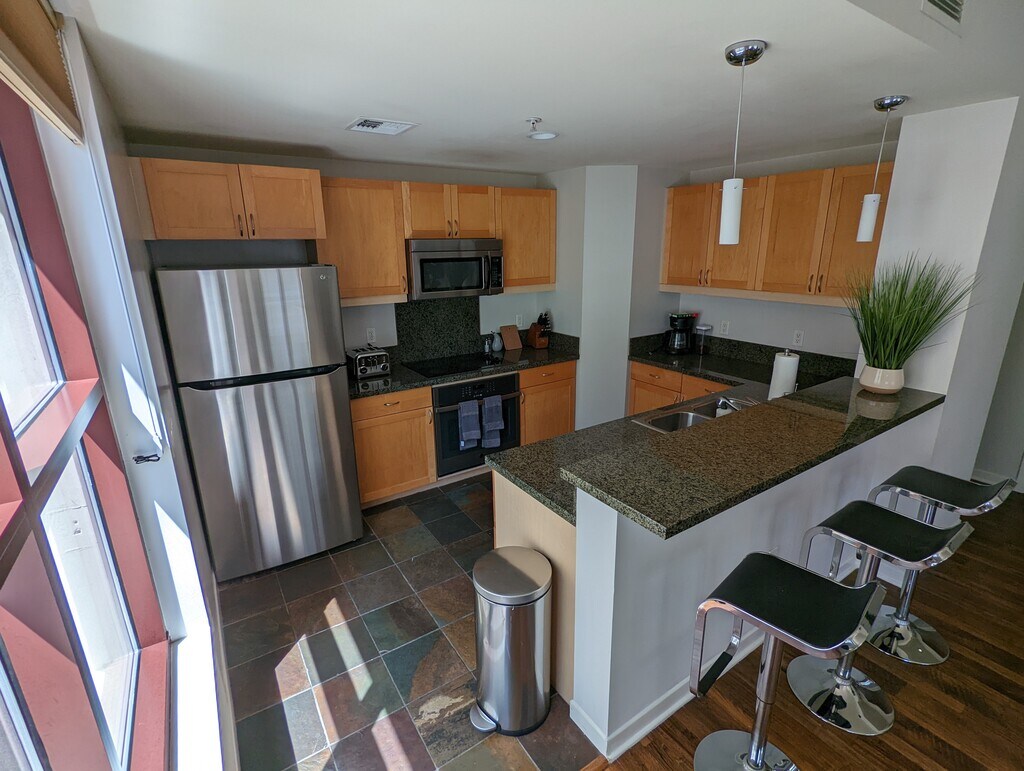 Don't miss this excellent opportunity to live in a fully-furnished modern, bright residence at Metrome with west-facing views of the tranquil Zen Courtyard. Delight in vaulted ceilings, engineered wood floors in the living area, and custom paint tones. The stainless steel and granite kitchen also features under-cabinet lighting, an eat-at bar perfect for casual dining, and easy-to-maintain slate floors. As you enter the Metrome community you will pass through the tranquil Zen Courtyard! Amenities available to residents include a meeting room complete with lounge area and kitchen, barbeque, as well as a well-equipped fitness center! Metrome offers a premium East Village locale across the street from the beautiful New Central Library and Thomas Jefferson Law School, 1 block from Petco Park, several great eateries and coffee shops around the block, just a few blocks to Gaslamp Quarter with more bars and restaurants and shops, and much of what Downtown San Diego has to offer. Welcome to the downtown living! LEASE TERMS Security deposit: $3,000 Water, garbage collection and internet included, $100 electricity credit per month Lease duration: 1+ months Pets policy: No pets Move-in requirement: first month's rent, plus security deposit RENTAL UNIT AMENITIES Fully Furnished Refrigerator Dishwasher Washer/Dryer Stainless Appliances Granite Counters Tub/Shower A/C & heater High Speed Internet BUILDING AMENITIES Security Gate Underground Parking Fitness Room / gym Community room with BBQ Ultra high speed internet connection BUILDINGS NEARBY The Mark, Alta, Legend, Strata, and ICON. Parkloft, Diamond Terrace, Pacific Terrace, Metrome, Fahrenheit, M2i, Park Blvd East, Park Blvd West, Nexus, Vantage Pointe, Element, Smart Corner, Union Square, and The Lofts. More modern than City Front Terrace.