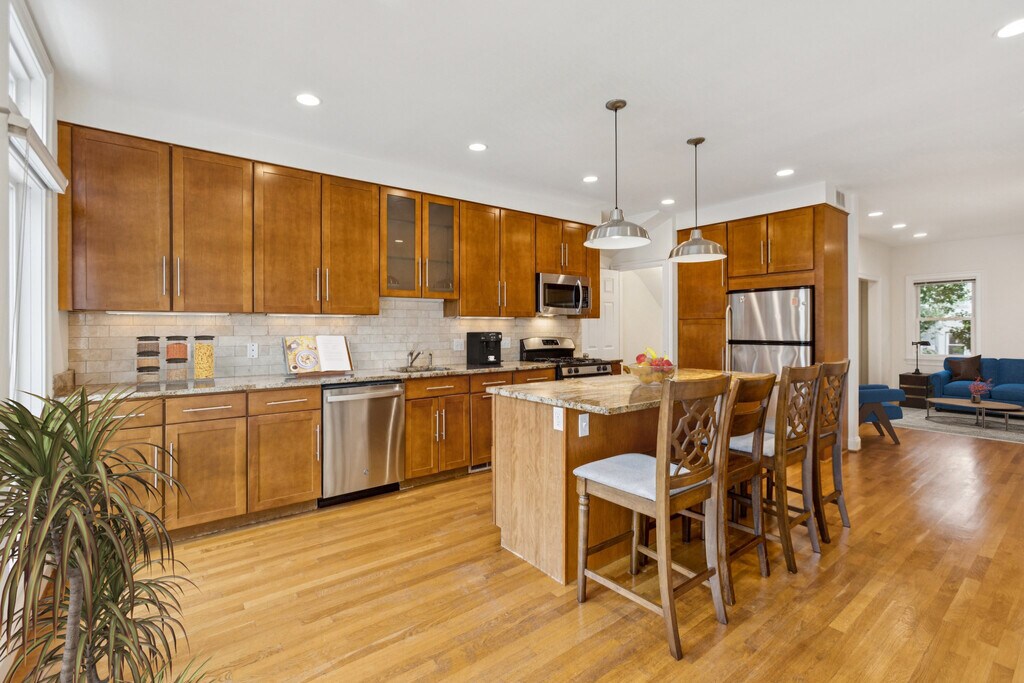 SUNNY, CHARMING, PORCH-FRONT ROW HOUSE - UNION MARKET/NOMA Gorgeous 3 bedroom 2 bath spread over 3 levels on a lovely quiet one-way street. Only 2 blocks to NoMa Metro, Union Market, Trader Joe’s, and steps to Whole Foods. Main floor has entrance hall with coat closet, living room with gleaming hardwood floors and exposed brick. Enormous combo dining / gourmet kitchen with huge island, granite and stainless, gas range, and sliding glass doors out to deck. Upstairs front bedroom has lofted ceiling, exposed beams, and brick, and walk-in closet, plus additional shoe closet. Equally large second bedroom has large closet, hardwood floors, and ceiling fan. Spacious all-white bathroom with double vanity, subway tile and bathtub / shower. Linen closet. Lower level has small desk/TV area with built-in bookshelf, plus full bath with shower, and large walk-out bedroom with exposed brick and sliding doors to covered porch. Full size washer/dryer and kitchenette with refrigerator and microwave. Large storage closet under stairs. Rear yard can be used as either patio or off-street parking and is fully fenced. Available immediately. One-year minimum lease. NO PETS.