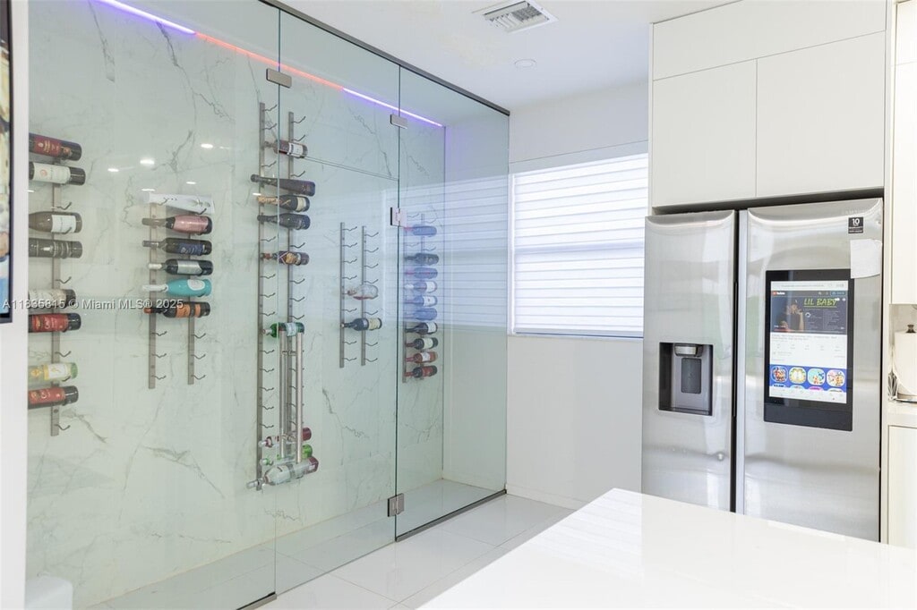 This renovated five-bedroom, three-bathroom home in the desirable Silver Palms community is a smart home designed for modern living. The property includes a pool and a two-car garage with its own AC split unit. Inside, you'll find smart home technology throughout, controlled by iPads for managing lighting and music. The home features zebra roll-down shades with blackout options, smart kitchen appliances, a wine room, and an impact-rated sliding door that offers a beautiful view of the pool from the living room. One bedroom and one full bathroom are conveniently located on the first floor. Courtesy of EXP Realty LLC.