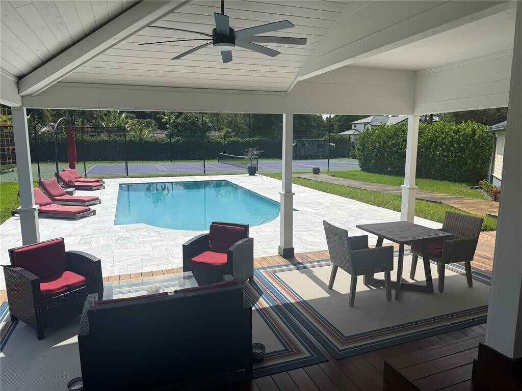 A rare rental opportunity in the prestigious "The Shire" subdivision. This completely remodeled, single-family residence sits on an 0.84-acre lot. Key features include a private pool and a versatile sports court, striped for both tennis and pickleball. The interior, with 4,768 square feet of luxury living space, features high-efficiency impact windows (Low-E) and a durable metal roof. The property includes a two-car garage. Courtesy of- Brokers, LLC