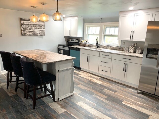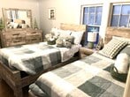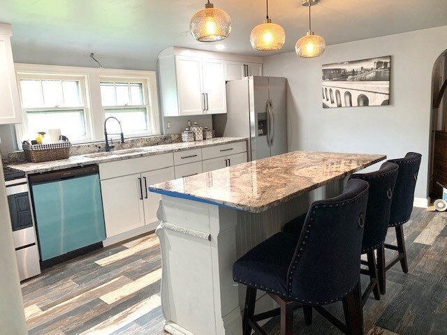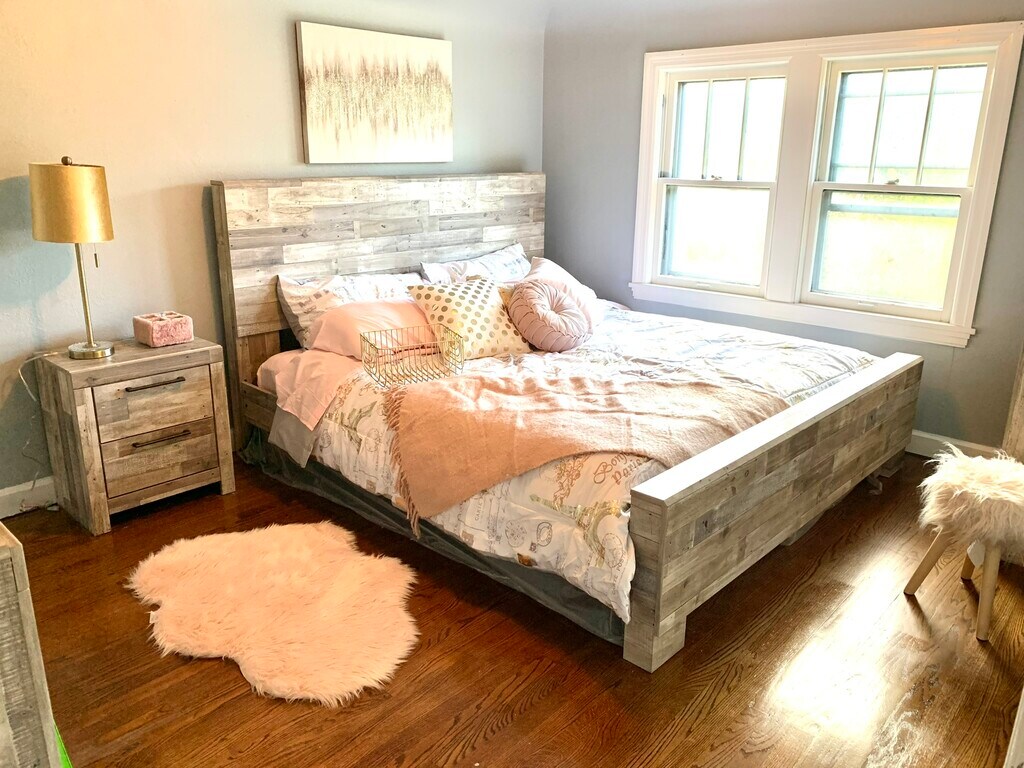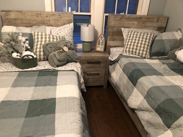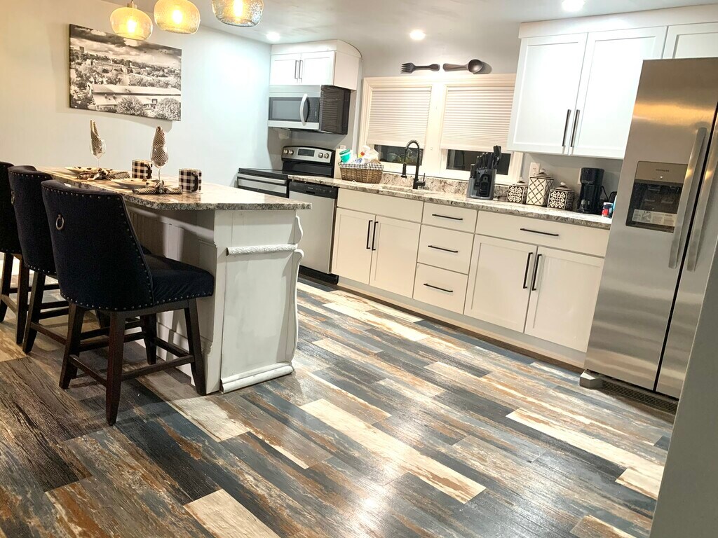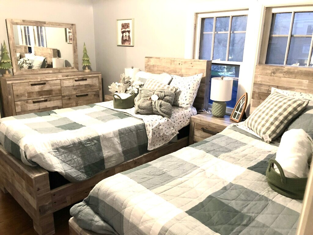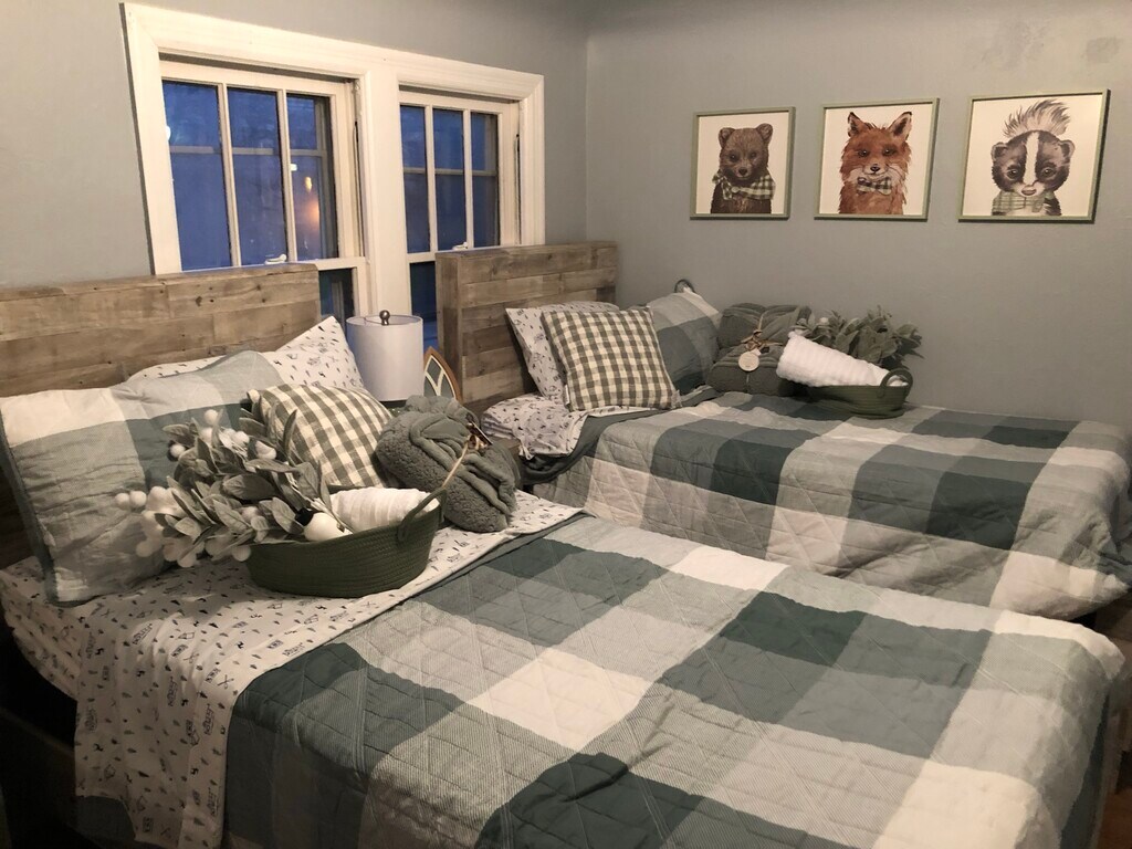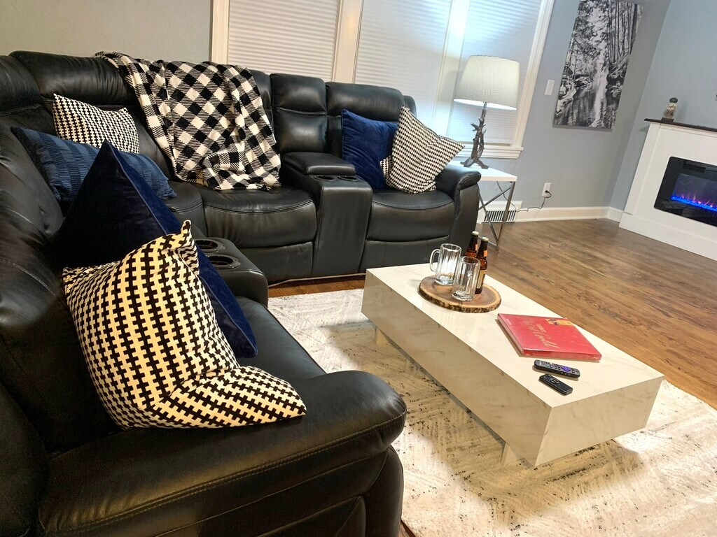 We are pleased to release our Checkered Penthouse, located in our Historic City Stadium House on the East side of Green Bay. This two-bedroom home includes a large dine-in kitchen with new granite countertops, an eat-up custom-made island. The kitchen has a fun modern urban loft-style flooring, abundant cabinetry, well-stocked items for cooking, and an upgraded appliance package. The living area has a cozy feel with a custom-made large electric fireplace, 65? TV, huge reclining sectional couch, houndstooth sitting chair, desk space for in-home office use, and decor that embraces the spirit of the community of Green Bay with local black and white photography and relevant outdoor accents. The bedrooms have a touch of glam with a decadent king bedroom and an adorably-sweet secondary bedroom with a pair of twin beds. This upper unit does have a set of stairs that are somewhat steep (typical of an older built historic type home). The laundry is located in the basement level of this duplex and is shared between the two units. This entire building can also be reserved, which includes three levels and a total of five bedrooms and seven beds.