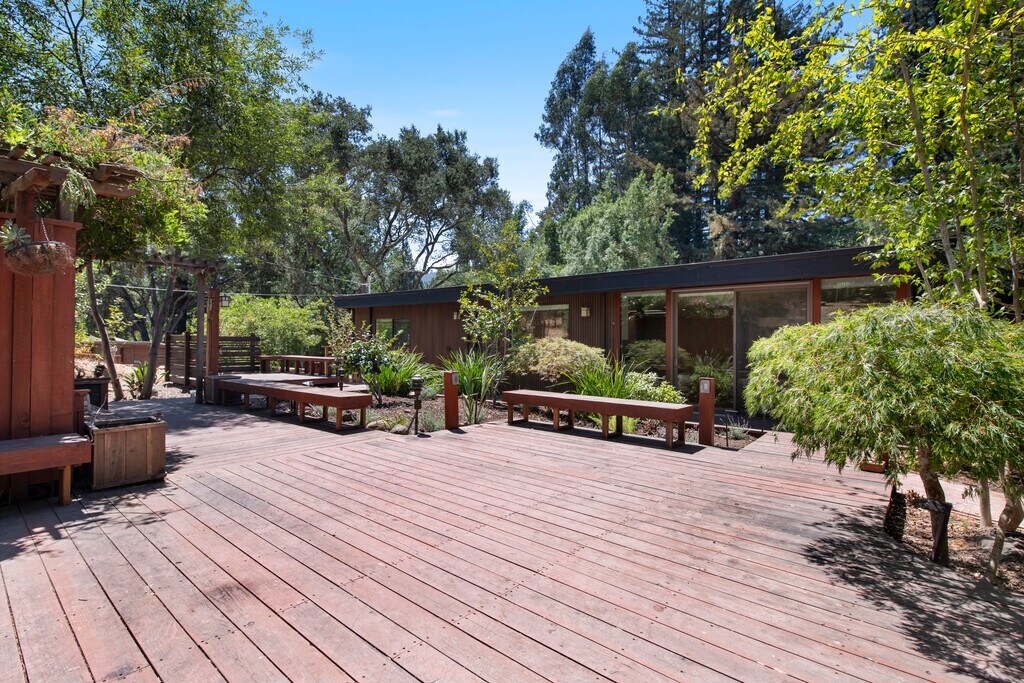 Main house has 3 bedrooms and 2 baths. Guest house (ADU) is 1 bedroom and 1 bath. Total sq footage is over 5,500 sq feet. This 3 acre property in sought-after central Woodside is a compound! Mid-century modern open concept home, fully remodeled inside and out. Just installed NewTechWood fireproof siding. Savor the expanse of nature from floor to ceiling windows. Theres custom cabinetry throughout, new hardwood floors, 4 electronic skylights, gas fireplace, stunning quartzite, onyx and marble in kitchen/bathrooms. Radiant heat in primary bathroom and two walk-in closets. Separate office/gym, a storage room and workshop areas on lower level. Enjoy multiple decks and patio areas. Updated 1 bdrm/1 ba vacant guest house. Third bldg. has office and large attached room with porch. Fourth bldg. is large storage room. Green concrete bottom oval pool, expansive gathering areas, gated entrance, extended parking, horse facilities (tack room, stalls, corrals), rare 2nd driveway, outdoor ½ bath, mature landscaping, burbling seasonal creek w/ trails. This property is an oasis and yet only 2.2 miles to 280!