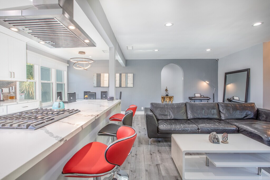 Rare offering in the heart of West Hollywood, set on a peaceful cul-de-sac. This exquisitely remodeled modern residence features a two-bedroom, two-bathroom main home with an open-concept floor plan and seamless indoor-outdoor flow to private front and rear gardens framed by mature greenery. Complementing the main residence is a distinctive, villa-style guesthouse offering a private living space with a full kitchen (gas cooking and refrigerator), an expansive spa-like bathroom, and dedicated storage—ideal for guests, a home office, or extended living. The property showcases a solar- and gas-heated saltwater pool with both indoor and outdoor Jacuzzis, creating an exceptional setting for refined living and entertaining. Fully paid electric solar panels and a dedicated solar pool heating system enhance energy efficiency. A true smart home, providing control of lighting, motorized window treatments, climate, pool and spa systems, door locks, TVs, and security (Ring doorbell and Arlo cameras) via smartphone or tablet. The chef’s kitchen is appointed with brand-new smart appliances, including one smart refrigerator and one smart oven, along with a built-in upscale microwave. Additional highlights include a gated driveway, ample street parking,