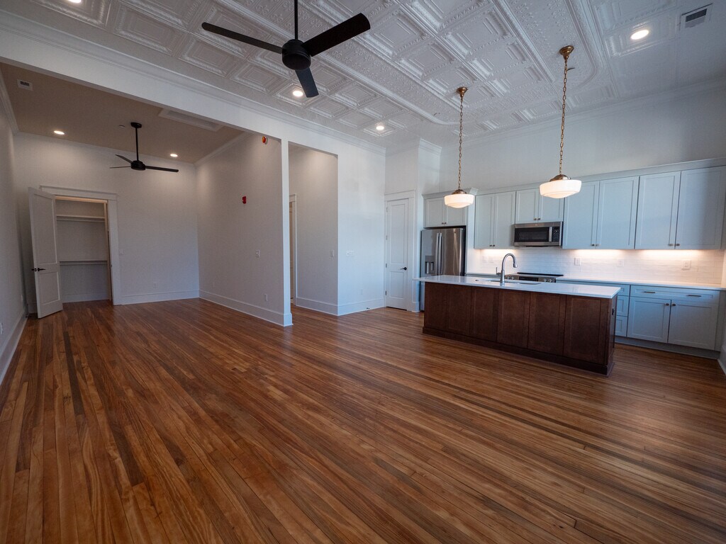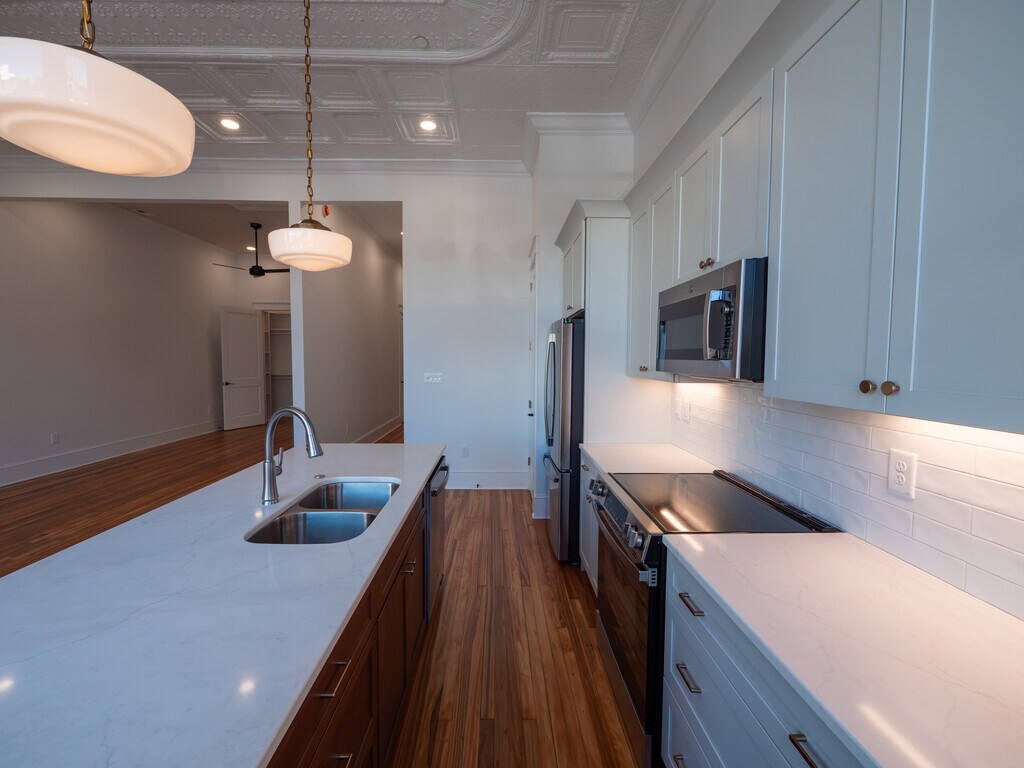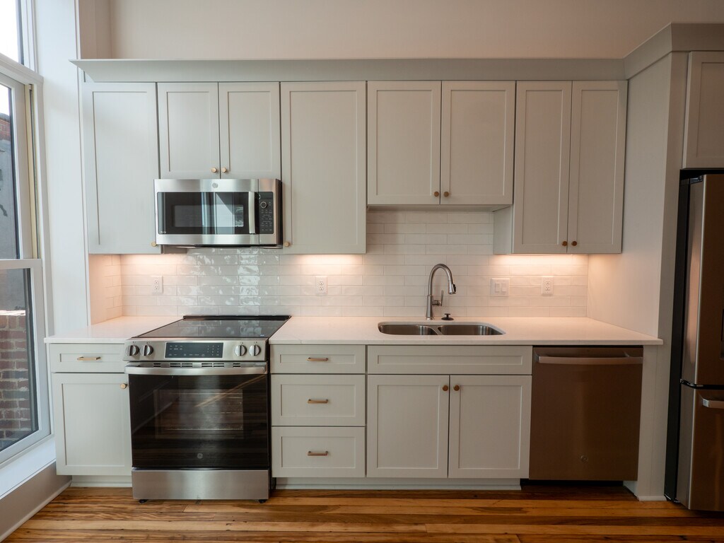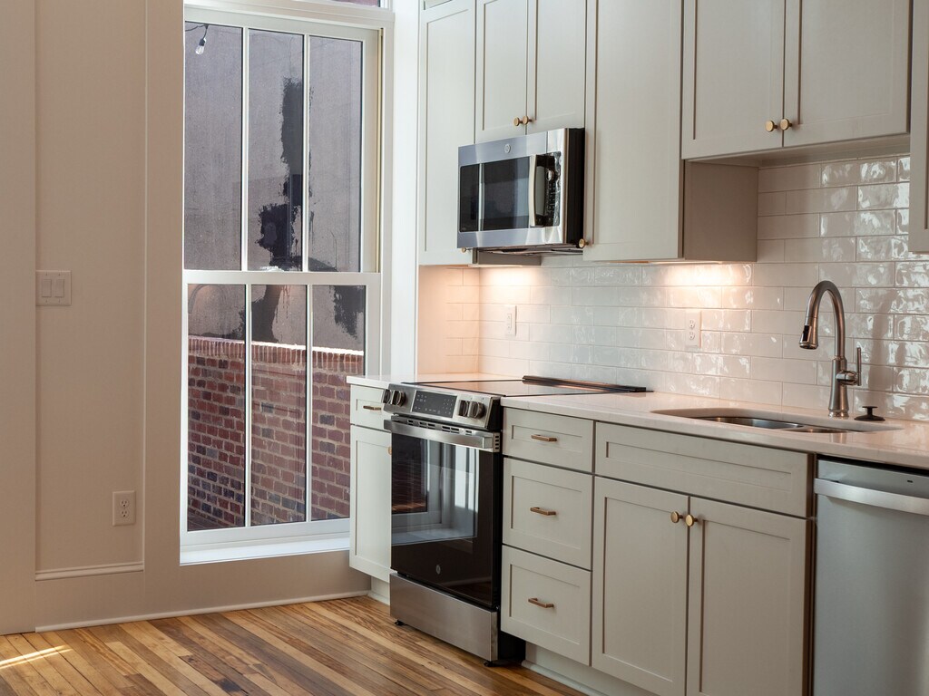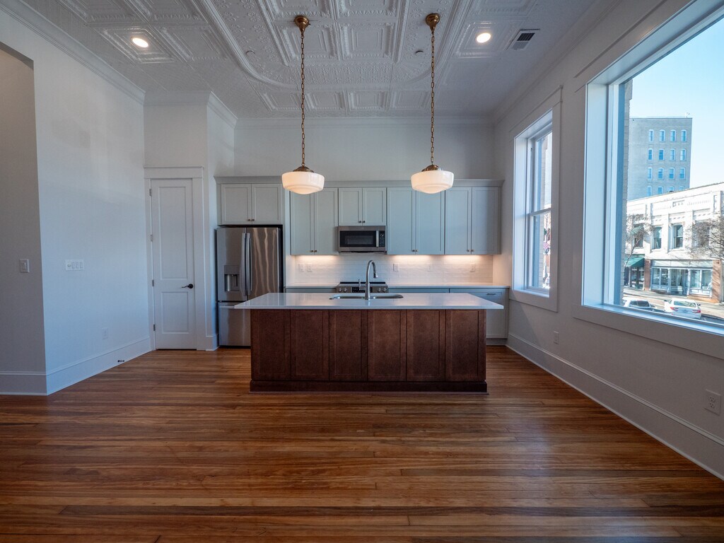 ALL UTILITIES, INTERNET, & MAINTENANCE INCLUDED IN AGREEMENT an additional +$540/month *** FURNISHED CORPORATE APARTMENT OPTIONS AVAILABLE. Welcome to Salisbury’s newest option for downtown living. This completely restored building features classic historic features in all units, including original decorative tin ceilings, and original hardwood floors. All bathrooms are top of the line with quartz countertops, subway tile wainscoting, wood cabinets, sconce lighting and high-end fixtures. Kitchens feature new GE stainless steel profile appliances, quartz countertops, stainless steel deep double bowl kitchen sinks, and under cabinet lighting. Full size laundry closets feature new full-size washers and dryers. Bedrooms have large closets with ample storage. Eight-foot doors throughout, 14-foot ceilings, ceiling fans, decorative and recessed lighting. Entry door includes Lockly keyless coded entry with camera. Central Avigilon Primary Entrance RFID system and shared external camera systems. Second floor apartment access is from the rear of the building with secure, RFID key fob entry. The first-floor lobby features tile flooring, a mailbox and package area, and elevator access. The second-floor lobby features the original hand pull freight elevator frozen in time as a historic accent, as well as original hardwood flooring, and original early 20th century pendant lighting. First floor apartment access is by RFID key fob through two historic iron gates sourced from Black Dog Salvage in Roanoke, VA. All building systems are new including security, sprinkler systems, elevator, electrical, gas, and plumbing. Unit 202: This second floor, front facing studio unit features a large kitchen island with Rejuvenation pendant lighting and brand-new low E glass in front windows.