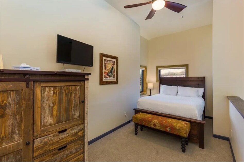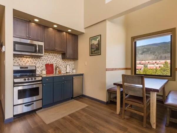 This updated and modern 2-bedroom, 1-bathroom condo is located just minutes from the Peru Chairlift in the Slopeside Condominiums community in Keystone. The residence features a dramatic two-story, lofted living area with mountain and creek views, abundant natural light, and high-end finishes throughout. Ideally situated next to Snake Creek, the condo offers a peaceful mountain setting while still being only a short drive to River Run Village and Lakeside Village. The unit is located at the end of the hallway on the top (3rd) floor, providing added privacy along with convenient elevator and stair access. Residents of Slopeside Condominiums enjoy shared amenities including two rooftop hot tubs, a grill area, fire pit, and on-site laundry facilities. The condo is currently furnished, though the owner is open to removing some or all furnishings depending on tenant preference. 6- or 12-month lease terms are available starting as early as April 15th. ________________________________________ Living Space The two-story living area creates an open and inviting atmosphere, with large windows that bring in abundant natural light and showcase beautiful mountain and creek views. The space features vinyl flooring throughout the main level and includes a mounted flat-screen TV. The entryway provides convenient wall-mounted hooks and a coat closet for gear and outerwear. ________________________________________ Kitchen & Dining The full kitchen is appointed with granite countertops, stainless steel appliances, and custom cabinetry. Adjacent to the kitchen, the dining area comfortably seats up to five people. The bathroom is located just past the kitchen and includes a granite-top vanity and a walk-in tile shower with dual shower heads—a unique feature complemented by impressive views. ________________________________________ Bedrooms The main-level bedroom features a queen-sized bed, full closet, and mounted flat-screen TV. The upstairs loft bedroom also includes a queen-sized bed, newer carpet, a mounted flat-screen TV, and an armoire closet, creating a comfortable and private retreat. ________________________________________ Storage & Parking The rental includes two ski lockers for additional storage—one located in the parking garage and the other on the first floor of the building. One parking pass in the heated underground garage is included. ________________________________________ Utilities & Additional Information All utilities are included. Laundry facilities are not located in the unit, but are conveniently situated two floors below and easily accessible via the stairwell. The prospective tenant has the right to provide a portable tenant screening report not more than 30 days old, as defined in section 38-12-902(2.5), Colorado Revised Statutes; and if the prospective tenant provides a portable tenant screening report, we are prohibited from charging the prospective tenant a rental application fee.” C.R.S. 38-12-904(1.5)(a)(IV)(d).