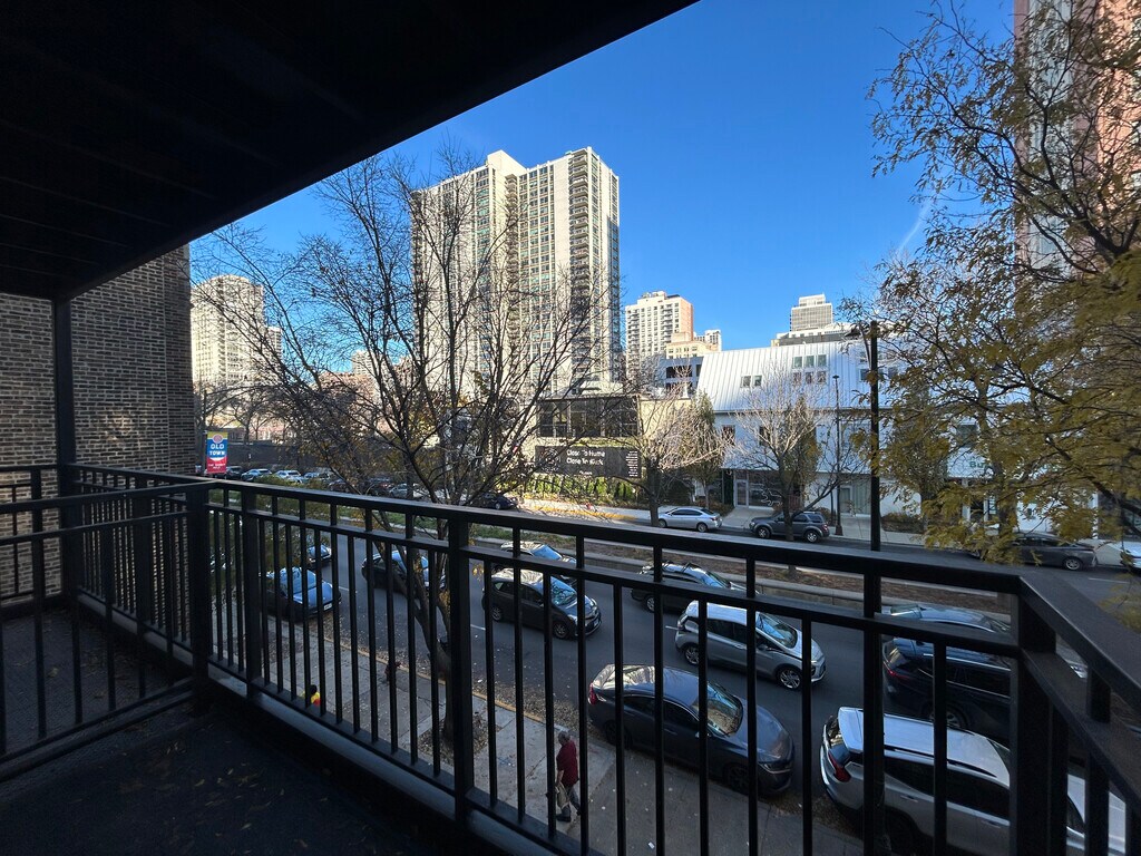 * Large Studio apartment with balcony overlooking La Salle Blvd (east-facing). Fully renovated within the last year. Features in-unit laundry, central AC, and walk-in closet. Additional storage available on-site and parking is likely to be available on-site within the next couple of months. * Amenities: - Hardwood Floors - Separate Kitchen - Dishwasher - Updated Bathroom - Air Conditioning - Miniblinds - Ceiling Fans - Plenty of Closet Space - In-Unit Laundry - Pet-Friendly Building - Garage Parking Available - Views of Chicago Skyline from Gorgeous Roof Deck