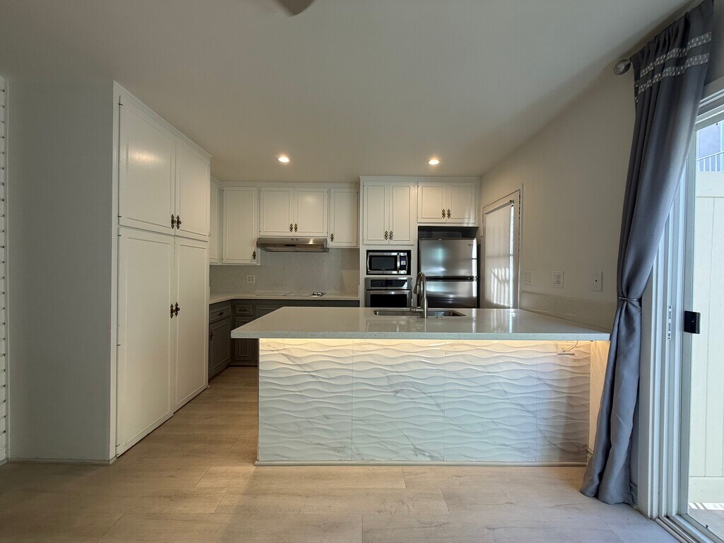 COZY AND PRIVATE FRONT END UNIT WITH HIGH END FINISHES. This lower level coastal vintage inspired home consists of: two private patios, newer laminate flooring, brand new kitchen cabinet doors and drawers w/soft and self-closing hardware, quartz counters and stainless steel appliances, large porcelain tiled bathrooms, dual glazed windows and sliders, ceiling fan and a fireplace for those cool chilly nights. Primary bedroom has two large closets and en-suite bathroom. No smoking. Pets (limited size and breed) will be extra. On-site laundry rooms. Water, gas and trash paid by owner. Tenant to pay for electricity and wifi/cable. Access to Westcliff mall across the street, shops and restaurants on 17th street steps away. Mariners Elementary and Newport Beach library within walking distance. Close access to the beach and bay.