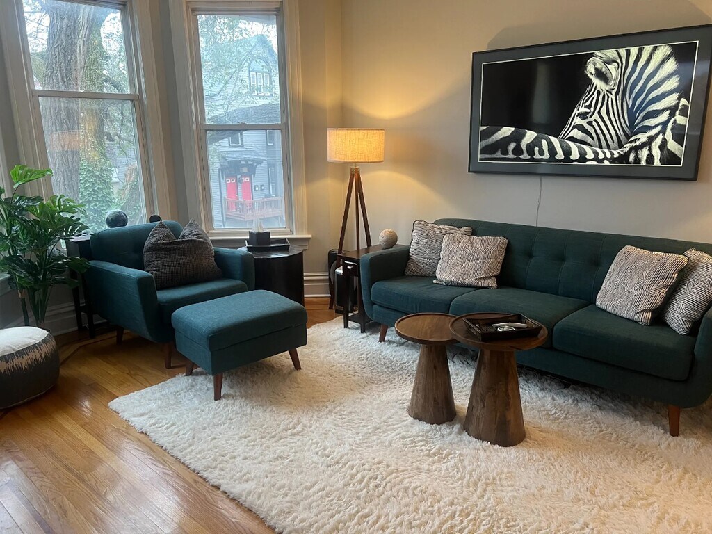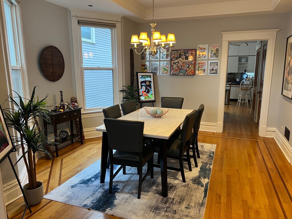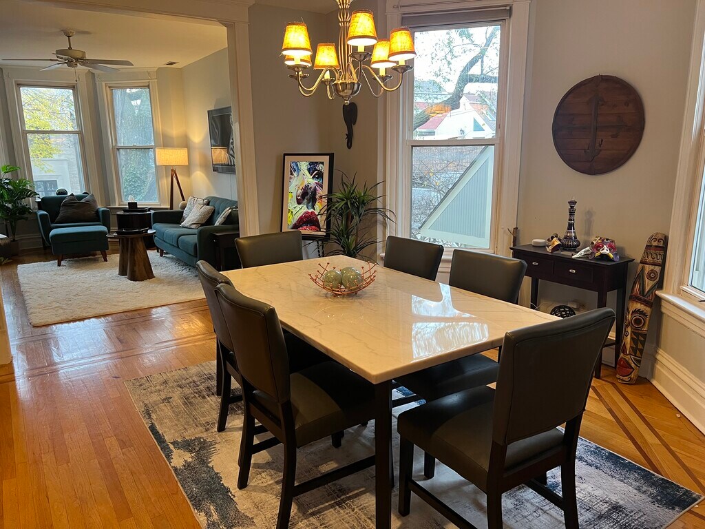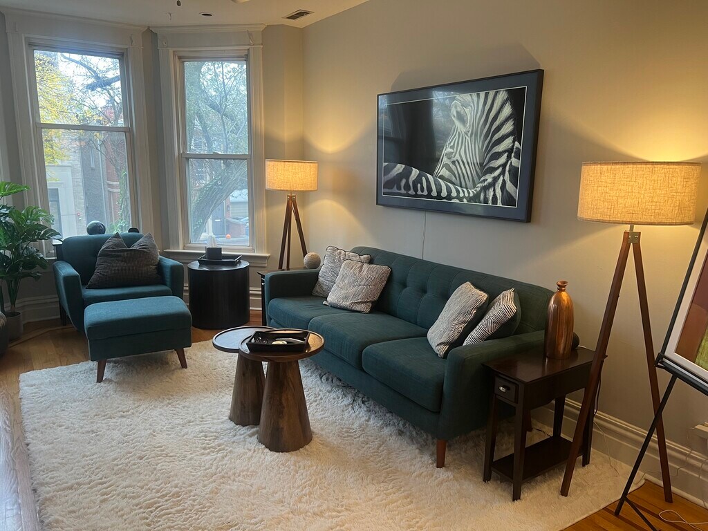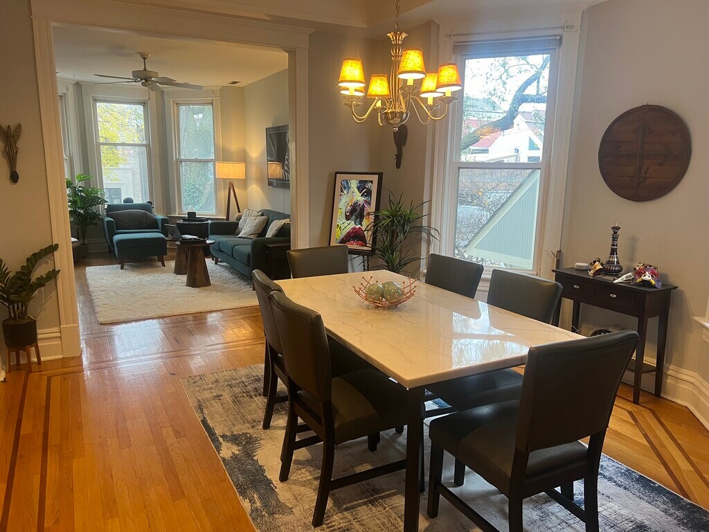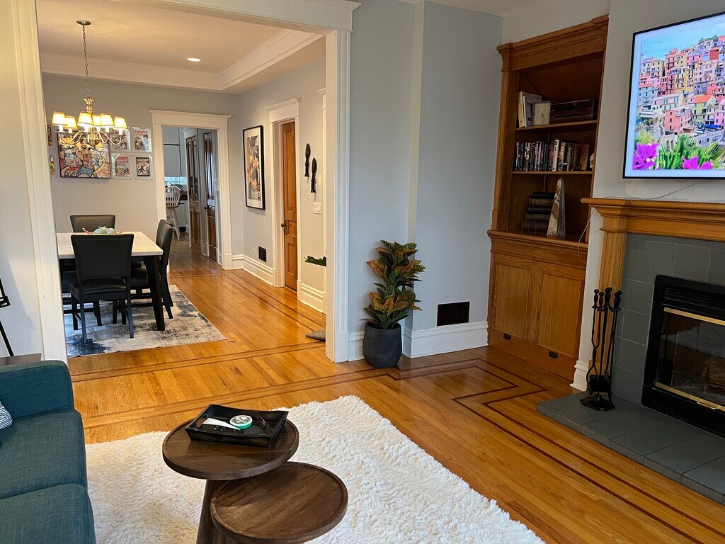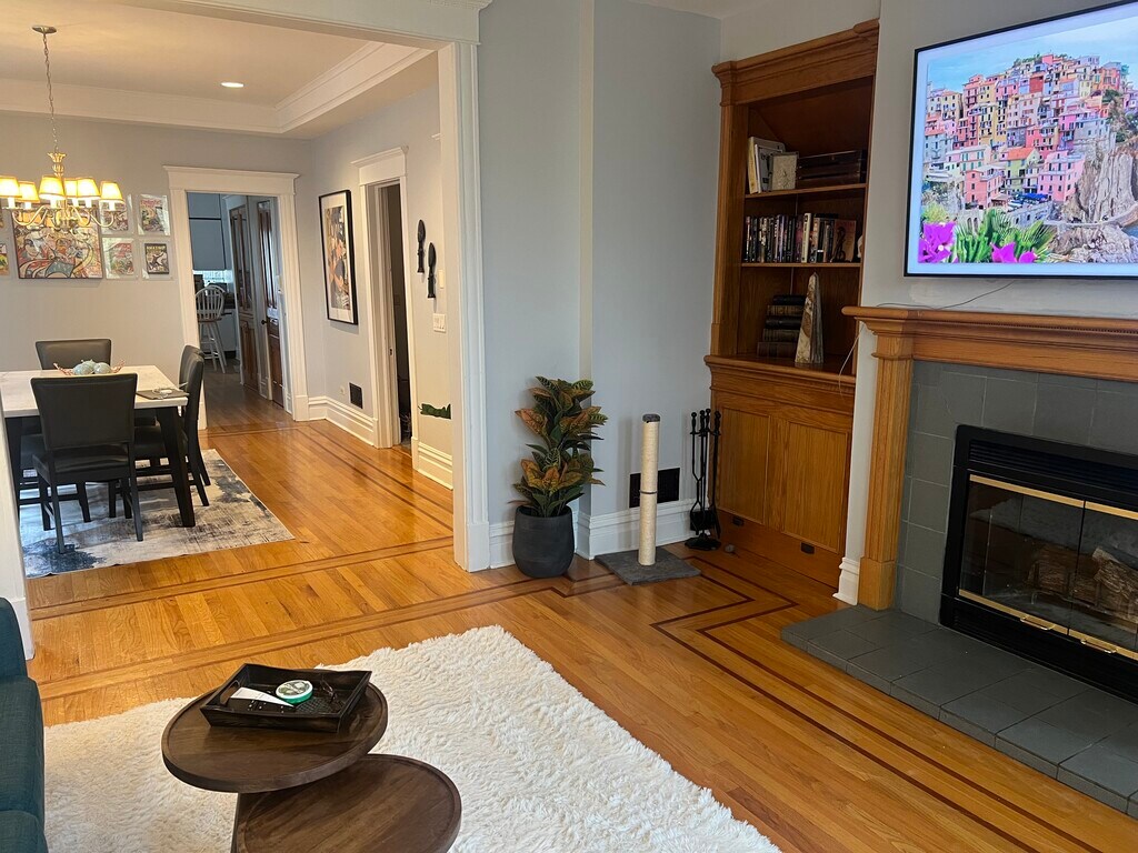 This short-term rental, top-floor, fully-furnished duplex, three-bedroom, two-bath unit is on a quiet street in a quiet building. The master bedroom has a spacious walk-in closet and a full private bath. The home has a working wood-burning fireplace, central AC and heat, dishwasher, fridge, gas-burning stove, and microwave. Hardwood floors are throughout, except the bedrooms and walk-in closet, which have wall-to-wall carpet. In-unit washer and dryer. This short-term rental is available from January 1st to March 31st, 2026. Stays from 32 days up to the entire three months are available. Minutes to the Diversey and Sheffield L line. One off-street parking space is included. Easy street parking (no permit required).