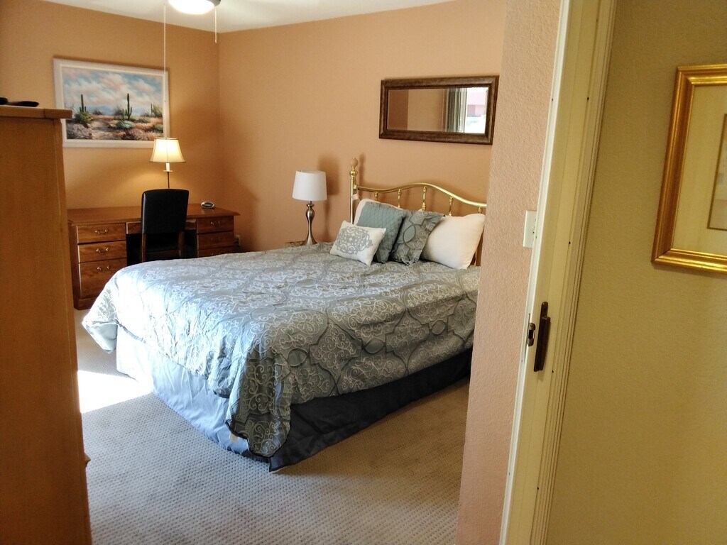 The unit is newly furnished and tastefully decorated. It is a No Smoking and No pet’s unit. This one-bedroom is ideal for two people. The kitchen presents as upscale, with slate counter tops and back splash. The major appliances includes a double door refrigerator freezer and overhead microwave. Everything you will need to whip up that ideal meal. In the tastefully decorated living area enjoy watching your favorite television on a new smart 50" TV installed with cable for hundreds of channels and shows to select from. There is also WIFI, so you are able access the internet and stay update on social media. Leave the living area through the sliding glass-door and you arrive at the patio, where you can enjoy an evening beverage or savor your morning coffee over looking the swimming pool. At night, move into the master bedroom and settle into your king size bed, with matching furnishings. Watch a last bit of television on the smart 32" TV in the bedroom, as you settle into a good night’s sleep. The master bedroom offers direct access to the patio and has a walk-in closet The bathroom provides you with granite counter tops and his and her sinks and there is an ample supply of soft towels and wash clothes. The unit additionally offers a full size washer and dryer. Great location in the beautiful gated Anasazi Village complex overlooking one of the five pools. Yes the pools are heated and OPEN!!! On-line $30 application fee to include TransUnion credit, criminal, and eviction reports - Min 650 credit score Non-refundable $250 cleaning fee $1,000 refundable security deposit Rates begin at $1,975 during winter months. (Utilities/Cable/Internet paid by Owner - Electricity over $100/mo paid by Renter) Non-refund $250 cleaning deposit; $1000 security deposit; no pets or smokers. $30 Application fee. MUST HAVE 650 CREDIT SCORE, no Bankruptcies.