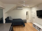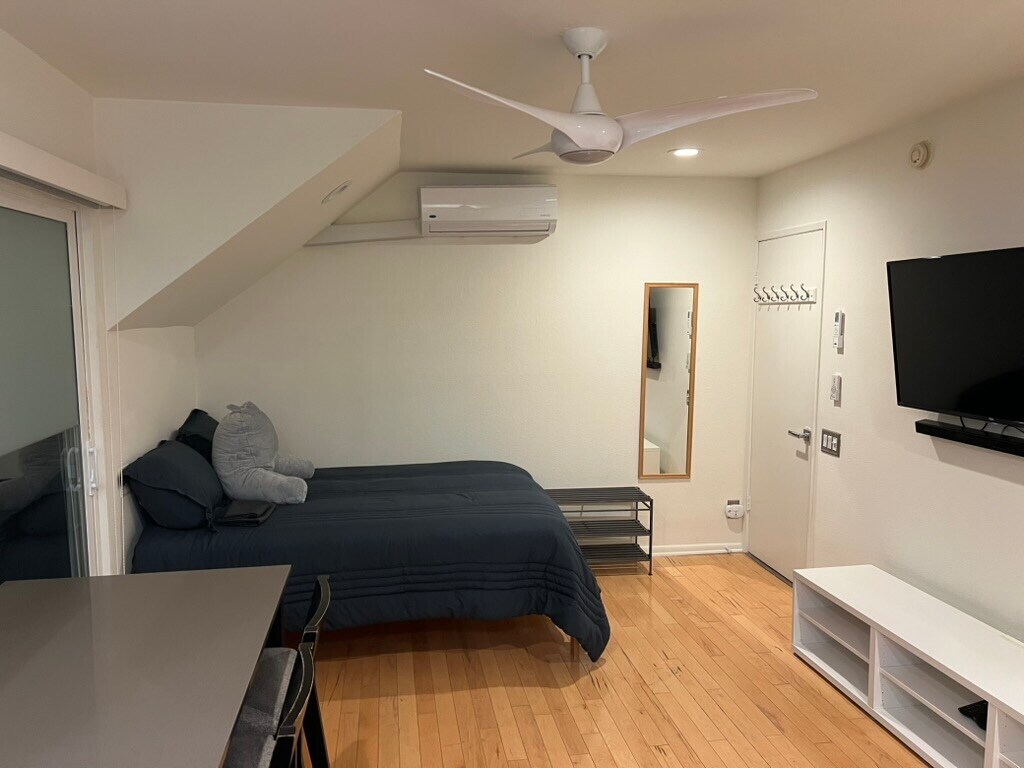 Private studio with its own entrance. Small space but comfortable and inviting. Small outdoor patio. Fully furnished with bed, small kitchen, table, and TV. Has a private bathroom, closet, and a small amount of outdoor storage. All utilities including WiFi included. Best for one, but can accommodate two. Location: Central Santa Monica, one block from Trader Joe's and Whole Foods. Close to Erewhon and Wilshire restaurants and shops. Walking distance to Montana Avenue. One block to St. John's Hospital.
