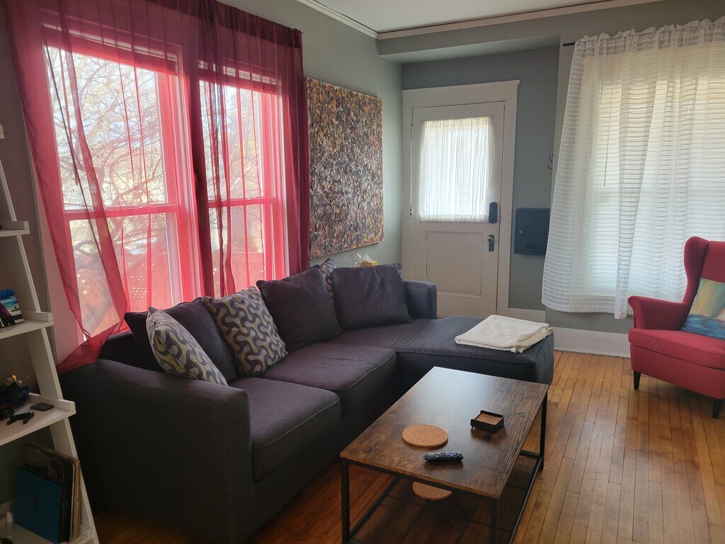 This property features 2 bedrooms, 1 small bedroom and 2 bathrooms within a total of 950 square feet. The living room offers ample space for relaxation and is designed for comfortable living. Additional amenities include heating, high-speed internet access, Wi-Fi, washer and dryer, and off-street parking. The exterior of the property is well-maintained, providing a welcoming atmosphere. This listing is ideal for those seeking a functional living space with modern conveniences. Tranquil and convenient location. Located in a quiet residential street and close to parks, grocery stores, restaurants, and just 5 minutes from downtown.
