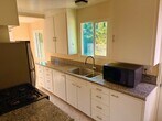 Well back from the road, Quiet area. Mature trees and fruit trees, lemon, peach, orange. Large off street parking area for one car, or two parked end to end.