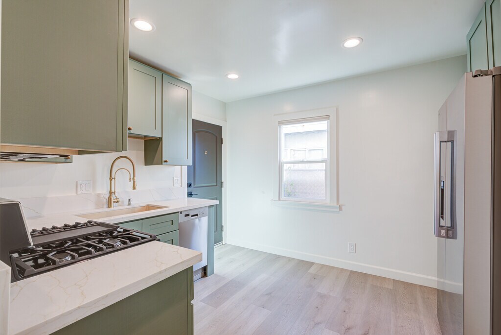 This ground-floor 1BR sits in a quiet, design-forward fourplex and has been completely reimagined with a warm, modern aesthetic. Wide-plank LVP flooring, soft arches, warm brass hardware, and gallery-smooth walls create a calm, refined interior. French doors in the living room feature upgraded multi-point locking hardware and wood-framed screen doors, adding character and a solid, well-crafted feel. A small vestibule off the living room creates a perfect nook for a desk or home workstation, with dedicated power outlets. The kitchen includes ample sage-green shaker cabinetry with antiqued brass knobs, a bisque quartz undermount sink with garbage disposal, brass sprayer faucet, and a full LG stainless appliance suite (French door refrigerator with water/ice dispenser, gas convection range, microwave with vent plus a stainless dishwasher. A window along the kitchen wall brings in natural light and gives the space a warm, residential feel. The bathroom is beautifully done with a walnut Edwardian marble-topped vanity, custom matte porcelain shower tile and wall niche, frameless glass doors, rain showerhead with hand wand, butcher-block shelving, wall-mounted vanity mirror with medicine cabinet, bright vanity lighting, small designer hardware details throughout, and dual-flush toilet. Updated systems throughout the unit include completely new electrical and plumbing, tankless water heater, new windows and doors, new HVAC units, new paint, new moldings, new color-correct LED lighting throughout, with dimmer switches. This lower front unit feels grounded and connected to the landscape. Exquisite dry garden of sculptural plants beneath windows and across property brings privacy, texture, and architectural interest. A small rear patio beneath the stairs provides easy outdoor access to rear citrus garden, garbage cans, laundry room and garages. Located in a quiet pocket of Valley Village with excellent access to Studio City, Sherman Oaks Burbank, North Hollywood, the 101 and 134 freeways, and Laurel and Coldwater Canyons. Features · Ground-floor 1BR in quiet boutique fourplex · Wide-plank LVP flooring (warm, modern finish) · Soft archways + gallery-smooth walls · French doors with multi-point locking hardware · Wood-framed screen doors · Brass interior hardware · Completely updated electrical + plumbing · Tankless water heater · Warm-color LED lighting · LG stainless appliance suite: • French-door fridge w/water + ice dispenser • Gas convection range • Microwave with vent · Stainless dishwasher · Sage-green cabinetry + antique brass knobs and hardware · Bisque quartz undermount sink with garbage disposal + brass sprayer faucet · Custom vertical tile bathroom with marble vanity · Frameless shower enclosure + hand wand · Quiet, vented bathroom fan · Dual-flush toilet · Private garage (new drywall, fresh paint, remote-controlled door) for $150/ month · On-site laundry (coin-op: $3.75 wash / $2.50 dry) · Rear patio access · New windows + doors · No pets · Renters insurance required · Move-in: first month + maximum allowable security deposit