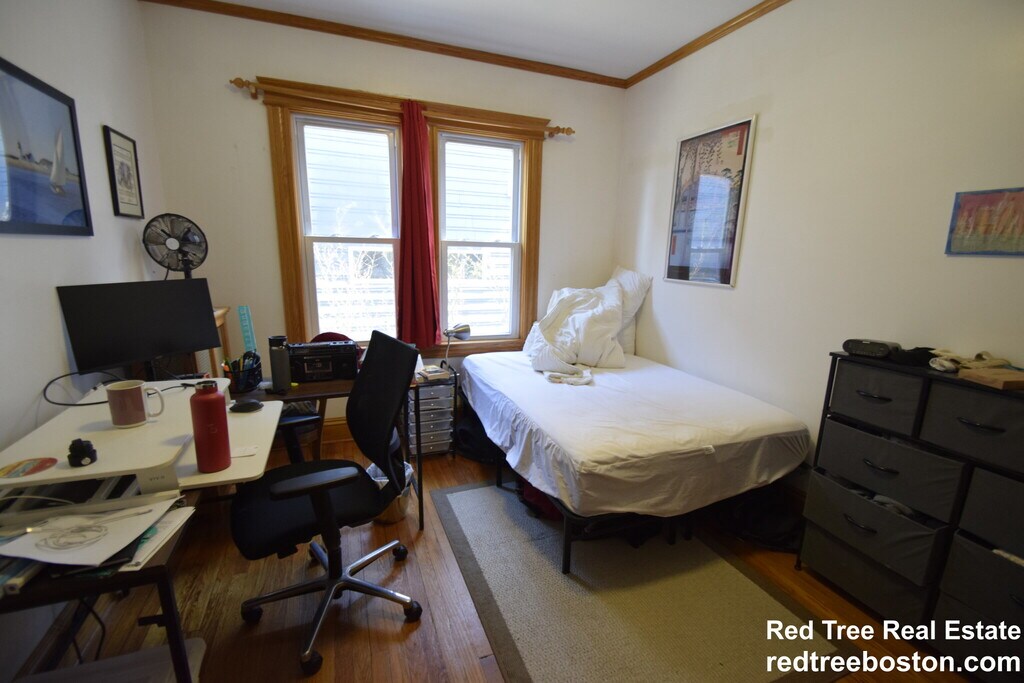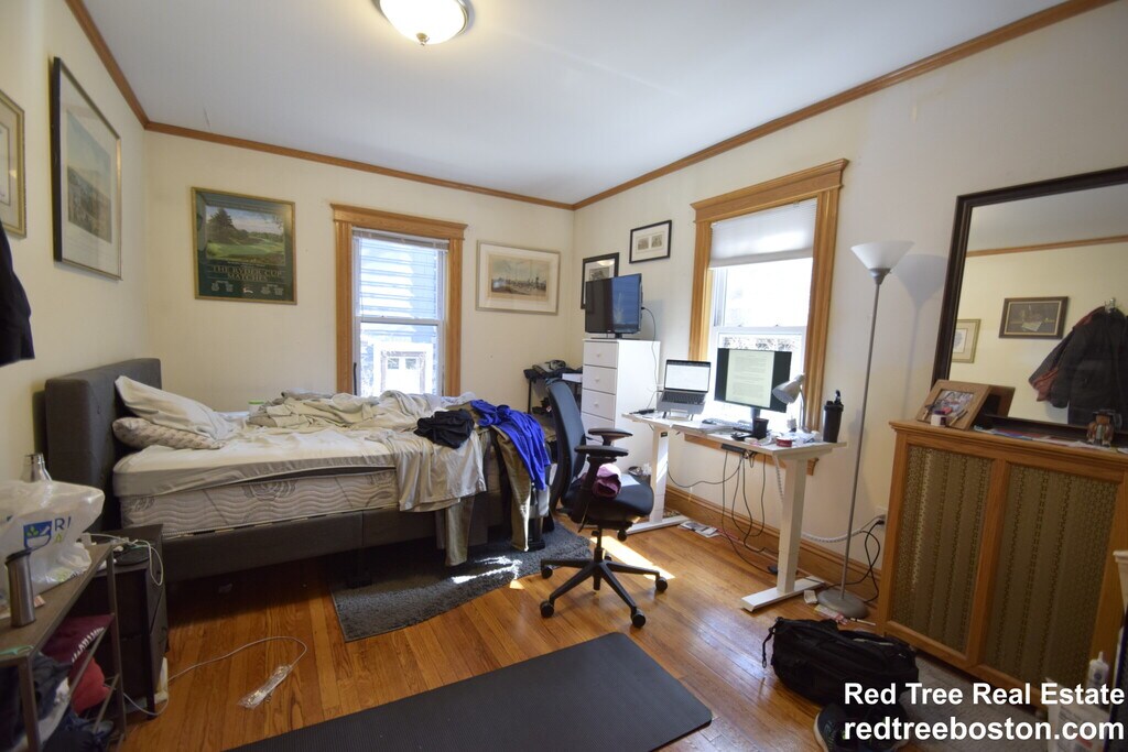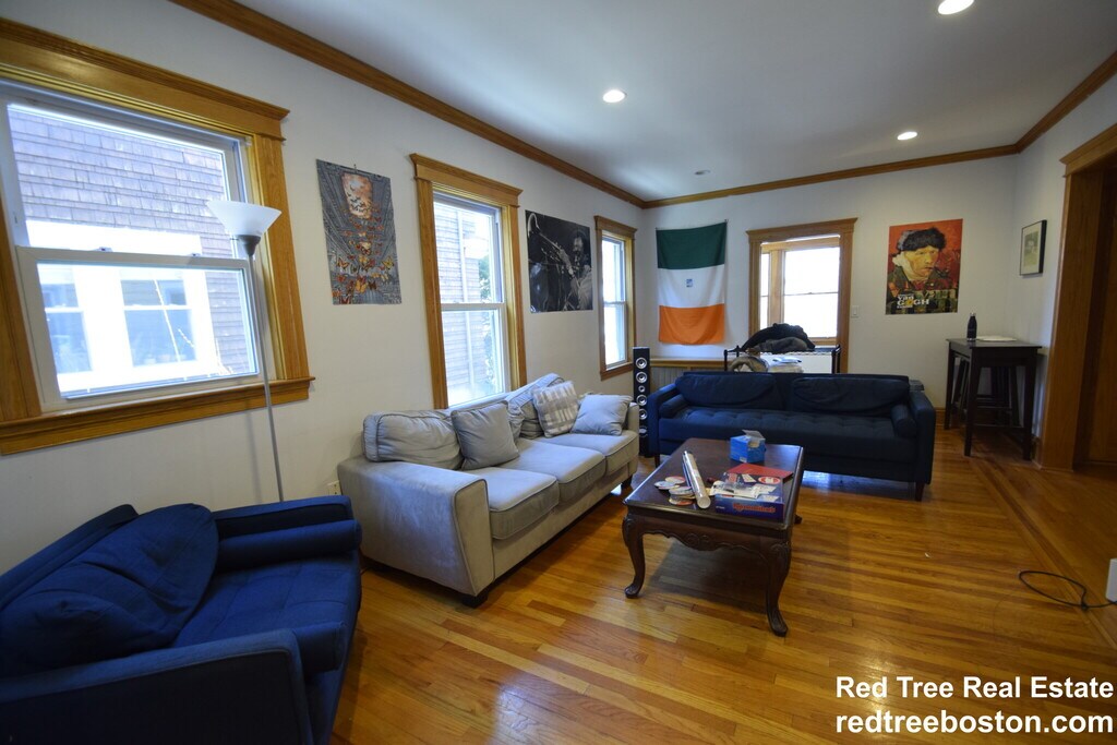 Large four bedroom in a 2 family house in quiet neighborhood on a tree lined street in brookline - features include hardwood floors, new energy efficient windows, freshly painted throughout, 1 room with new walls and top of the line andersen windows, laundry in the basement, modern eat-in kitchen w/ breakfast nook, brand new gas range with double oven, dishwasher and disposal, living room, dining room, modern bath, front and back porch. Close to the T and BU.