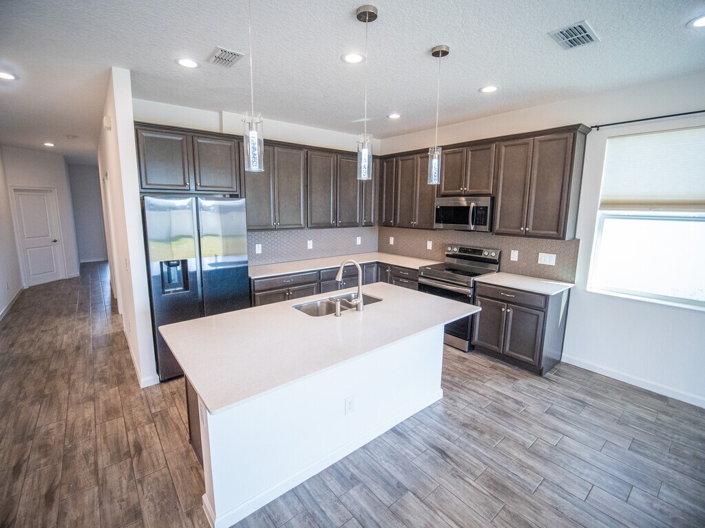 Welcome home to Redbridge Square, where thoughtful design, modern finishes, and a true sense of community come together in this immaculate four-bedroom, three-bath residence. From the moment you arrive, the home’s paver driveway, manicured landscaping, and welcoming covered front porch set the tone for what’s inside. Step through the front door and you’re greeted by a light-filled, open-concept floor plan with wood-look tile flooring throughout, offering both style and durability. At the heart of the home is the beautifully appointed kitchen, designed for everyday living and effortless entertaining. It features quartz countertops, a large center island with bar seating, rich wood cabinetry with crown molding, stainless steel appliances, and a designer tile backsplash that ties the space together. This inviting kitchen flows seamlessly into the spacious living and dining areas, creating the perfect setting for family gatherings, holidays, or relaxed evenings at home. The primary suite is a peaceful retreat, complete with a ceiling fan, generous walk-in closet, and a spa-inspired ensuite bath featuring dual quartz vanities and a glass-enclosed, walk-in tiled shower. Two additional well-sized bedrooms, each with ceiling fans and built-in closets, share a stylish full bath with a quartz-topped vanity and tub/shower combination. The fourth bedroom offers its own private ensuite, making it ideal for guests, multigenerational living, or a home office, and includes a walk-in closet and a bath with quartz vanity and tub/shower. An inside laundry room adds everyday convenience, while sliding glass doors lead you outdoors to a paver lanai and expansive backyard—perfect for soaking up Florida sunshine, entertaining, or creating your own garden oasis. Residents of Redbridge Square enjoy access to resort-style amenities, including a sparkling pool with cabana,playground, soccer field, and a picturesque lakefront gazebo, ideal for weekend picnics and sunset views. With low HOA fees and NO CDD, this community offers exceptional value. Perfectly located in Davenport, you’re just minutes from Posner Park’s shopping, dining, and entertainment, AdventHealth Hospital, top-rated golf courses, and only 16 miles from Walt Disney World. Property has solar panels so enjoy low power bills. Owner is looking for a 7 month lease