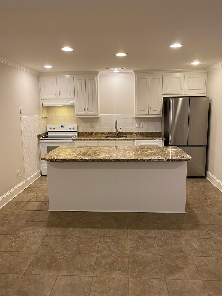 The garden entrance from two private parking spaces follows a stone lighted walkway to the patio entrance. Open the door to a beautiful tray ceiling great room with kitchen and island at one end and forest view at the other. The soft newly painted wall color and overhead lighting highlight the room. Soft pull down shades afford privacy. The granite countertop kitchen area with island provides ample storage. The new refrigerator is to the right. The washer and dryer are closeted to the right and the pantry, additional walk into storage is to the left. Down the hall are two newly carpeted bedrooms with custom built closets. The bathrooms are well lit. The units sits in a neighborhood cut-de-sac and affords a perfect location to downtown, shopping, restaurants as well as the university.and the Bolin Creek greenway. This apartment is rarely available.