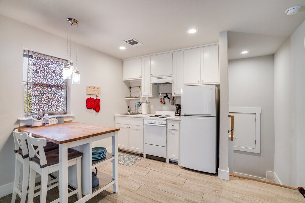 This studio loft is a completely separate entrance from our home and is right above our garage. There are no shared walls with our family's living space. There's a stacked laundry/dryer right next to the full bath. Also, there's a small but fully equipped kitchenette with a fridge, oven, microwave, and range (no dishwasher). The loft apartment is in a gated group of private family homes, and overlooks the rest of the property; a peaceful tree-house among our elms. All our renters have commented on the peaceful experience of staying in the loft.