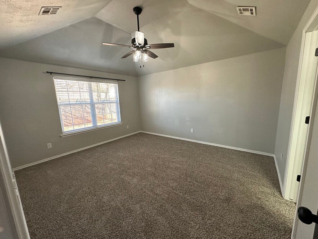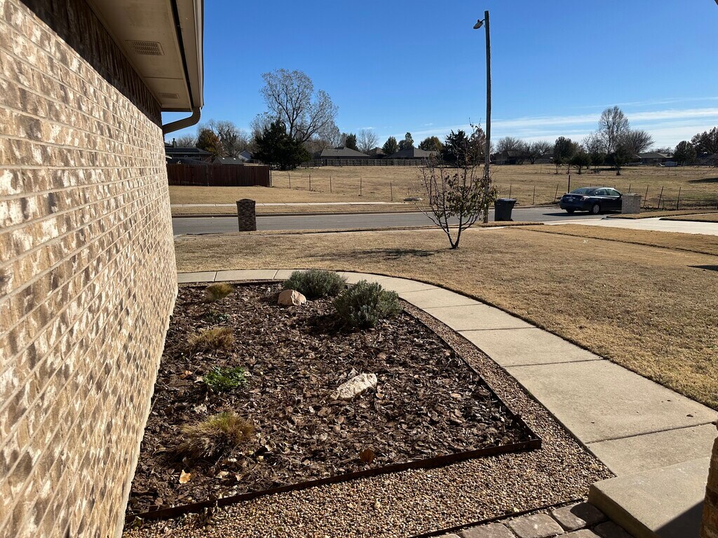 Move-in ready 3 bedroom, 2 bathroom home located in a quiet Yukon cul-de-sac with a rare open-land view directly across the street. Features include brand new carpet, vaulted ceilings, an open floor plan, and a reclaimed-wood accent wall. The living area offers a wood-burning fireplace with a gas starter, and the kitchen includes generous counter space along with an electric range, dishwasher, and microwave. Split-bedroom layout provides added privacy, with the primary suite separate from the secondary bedrooms. The home also includes a fully fenced backyard with a large concrete patio. Owner provides lawn care.