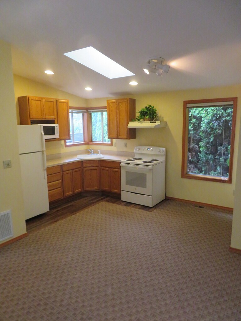 Large Garden Apartment in Upscale Neighborhood Rarely available newer studio/one bedroom apartment in quiet, upscale, English Hill neighborhood in Redmond, Washington. The apartment has separate private entry. This comfortable apartment has a sky-lighted great room with kitchen/eating area, lounge, sleeping area, and separate large, tiled bathroom with walk-in shower. The apartment can easily be converted to a separate bedroom using the existing curtain divider between the great room and sleeping area. It has a sliding door and large window for the tenant to have close views of a beautiful garden. There is also an atrium garden view right outside one apartment window. Appliances include refrigerator, stove, washer/dryer, and microwave. The rent includes utilities (electric, gas, water, sewer, and waste disposal). Internet connection available (extra). Private tenant paved parking space. Additional parking spaces for guests on the street. Easy access to 520 and I-405. No smoking. Pets OK with approval. Minimum year lease. Earlier move in possible: $1,890/month. Available April 1. Shown by appointment. Application and background check. Main Amenities: Great Neighborhood with Trails Access to Lovely Gardens and Atrium Newer Flooring, Carpet, and Paint Private Gated Paved Access to Apartment Skylights for Sunshine Sun Deck Optional Spa Use Terms: One-year lease preferred: $1,890/month. First and last month’s rent. Refundable security deposit, $1,500. Payment schedule available. Application and background check. Shown by appointment. No smoking, Pets OK with approval..