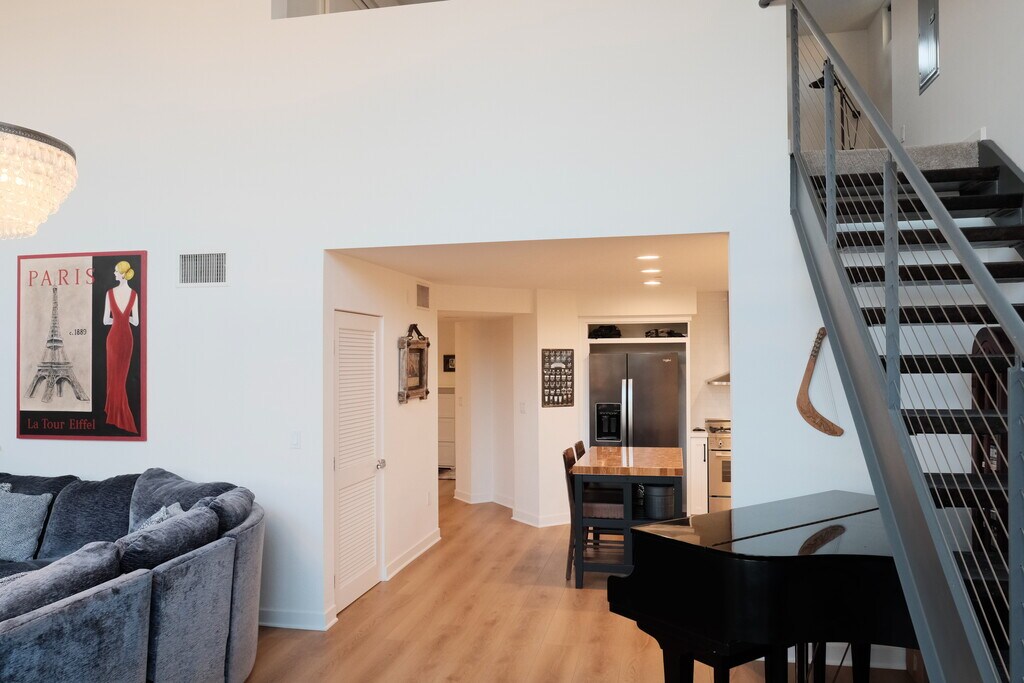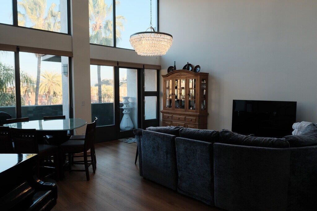 Discover the 'wow' factor in this stunning end-unit penthouse at Concerto Lofts! Originally developer's unit, with unique floor plan. The main level features a spacious formal entry, brand new wide plank vinyl flooring throughout, and an enclosed bedroom with high ceilings, multiple windows, and a walk-in closet with built-in organizers. Across the hall from the bedroom is a fully updated bathroom with a subway-tiled shower/tub, quartz vanity, and beautiful stone tile backsplash. The updated, open kitchen boasts quartz countertops, a Kohler farmhouse sink, Bertazzoni stove/oven, and upgraded appliances, including a Whirlpool fridge and LG dishwasher. Continue to the dramatic great room, which is full of natural light and features ~17-foot ceilings, floor-to-ceiling windows with automatic shades, and head-on views of Concert Park and the LMU Bluffs. Continue to your large, private balcony with a fireplace for outdoor relaxation. Upstairs there is a loft bedroom that has an updated en-suite bathroom with dual-sink vanity and travertine tiled shower. Additional features include newer AC, an LG washer/dryer, 1 assigned garage space with EV charger in the community garage. Located just across the park from several great restaurants and retail staples, and a short distance to gyms, pools, parks, and all Playa Vista amenities. Resort & Centerpointe Club membership activation flat fee of approximately $30 per person is tenant's responsibility. Move-in ready furnished monthly rental includes fully equipped kitchen with dishes, silverware, pots, pans, coffee maker, utensils, etc. Bed, bath and kitchen linens provided. Furnishings include 5’ baby grand piano, large 2 station desk, king bed (primary), queen bed (guest), bar height dining table & stools, dressers, lazy-boy reclining sofa, and entertainment center with TV. Games & puzzles available for guest use. This is our private residence when in the LA area, so exact furnishings and supplies may vary from the photos as we update and replace items. Available May 1, 2026 for 6 (minimum) to 18 month (maximum) lease duration. Tours by appointment after prequalification.
