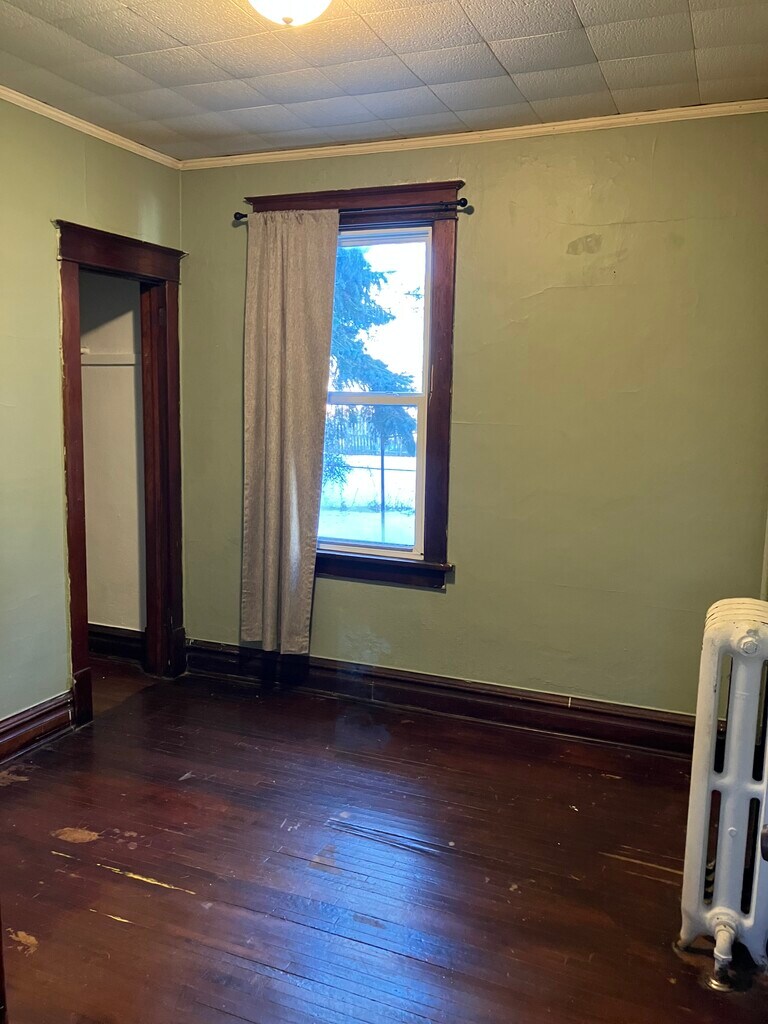 Lower duplex. Radiator heat. Tenant pays utilities. Owner shovels and mows. Fenced-in backyard. First month rent and one month security deposit due at signing. Length of lease negotiable.